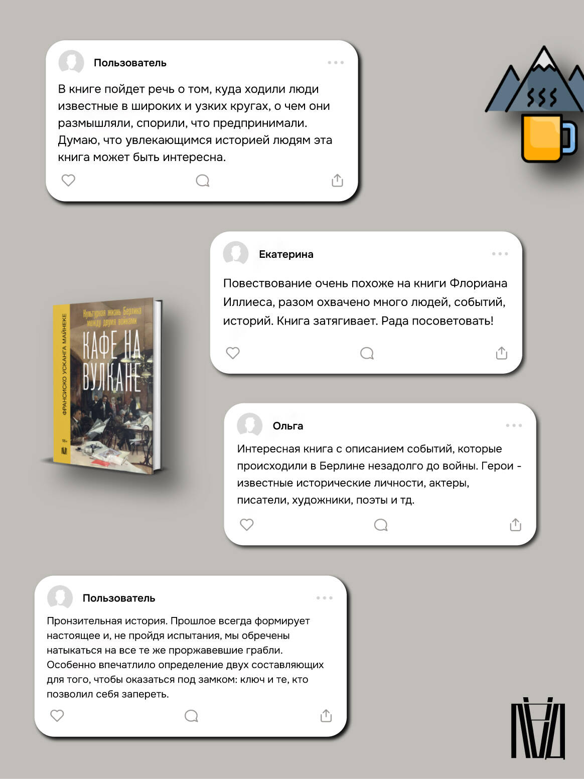 Книга испанского историка Франсиско У. Майнеке предлагает погрузиться в атмосферу Берлина в период между мировыми войнами. В основу книги "Кафе на вулкане" легли изученные автором официальные документы, мемуары, дневники богемного общества Берлина 30-х гг. XX века. Через историю культового "Романского кафе", которое становится центром повествования, раскрывается начало самой масштабной катастрофы ХХ века - зарождение нацизма. Надвигающийся фашизм становится мрачной тенью на фоне расцвета культуры, постепенно захватывая власть. "Романское кафе" в Берлине объединило умнейших людей того времени. Именно за его столиками посетители могли встретить Бертольта Брехта, Стефана Цвейга, Марлен Дитрих, Альберта Эйнштейна, Билли Уайлдера. Эта книга - напоминание о том, насколько зависимой и трагичной может оказаться тесная связь культуры, искусства и политики.| Издательство | Издательство "АСТ" |