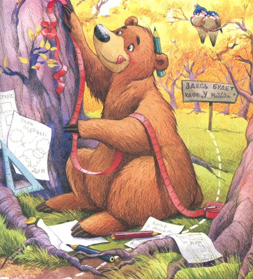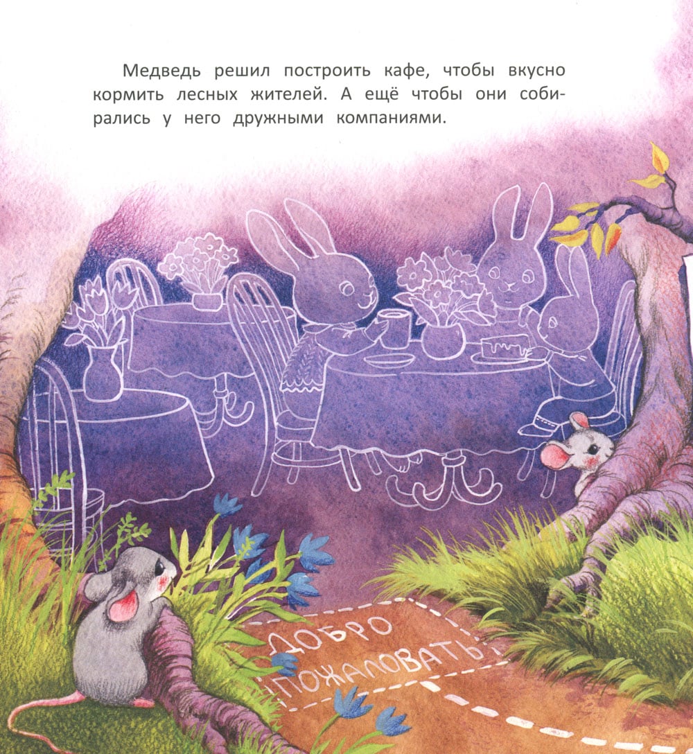 Медведь решил открыть в лесу кафе. «Прекрасная идея! - решили звери. - Наконец появится место, где можно собираться с семьёй и друзьями, где будет приятно вкусно поесть и отпраздновать день рождения». Все наперебой стали предлагать Медведю свою помощь. Ведь построить кафе - дело непростое. Но вот беда: Медведь решил всё делать сам. Ну не нравилось ему, как другие звери крышу мастерили и стены красили. Может, и у тебя среди знакомых есть вот такие медведи? Которые «сами с усами»? Тогда срочно дай им почитать эту книжку. Может, они про себя что-то поймут.