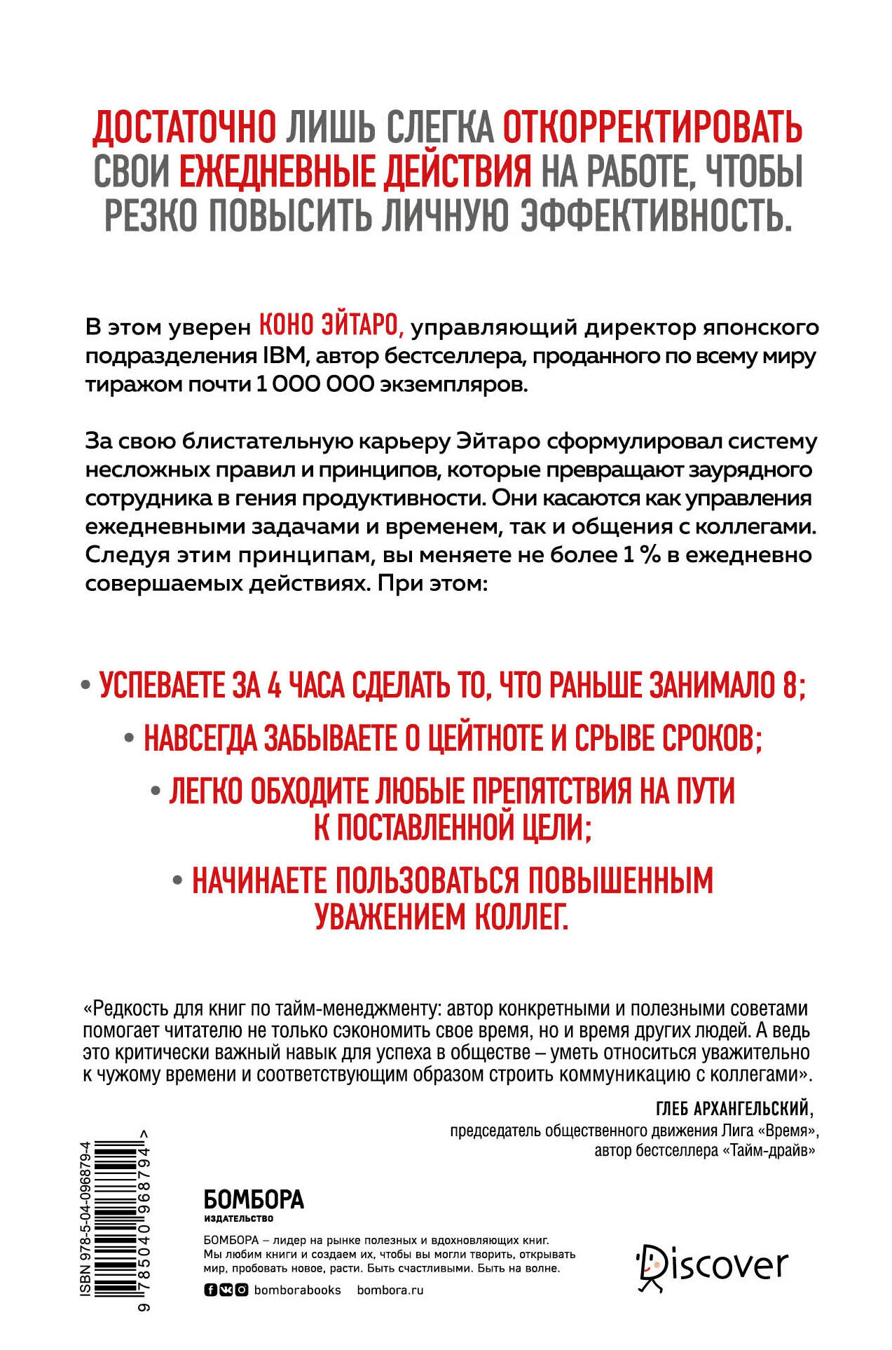 Достаточно изменить 1% своих ежедневных действий, чтобы получить феноменальные результаты в личной эффективности! Книга содержит главные секреты общения с руководством и коллегами, успешной презентации своих идей, управления временем и достижения целей. Автор объясняет, почему нужна совсем небольшая корректировка в поведении, чтобы увидеть принципиально большие результаты своей деятельности. Эйтаро Коно - управляющий директор японского подразделения IBM. Автор бестселлера, проданного по всему миру тиражом почти 1 000 000 экземпляров - «1% лидеров обладает качествами, которых нет у 99% людей». Вы узнаете, как: • выйти на новый уровень благосостояния; • поднять свой авторитет; • достигать целей вопреки всем препятствиям; • делать за 4 часа то, что занимало 8.| Издательство | ООО "Издательство "Эксмо" |