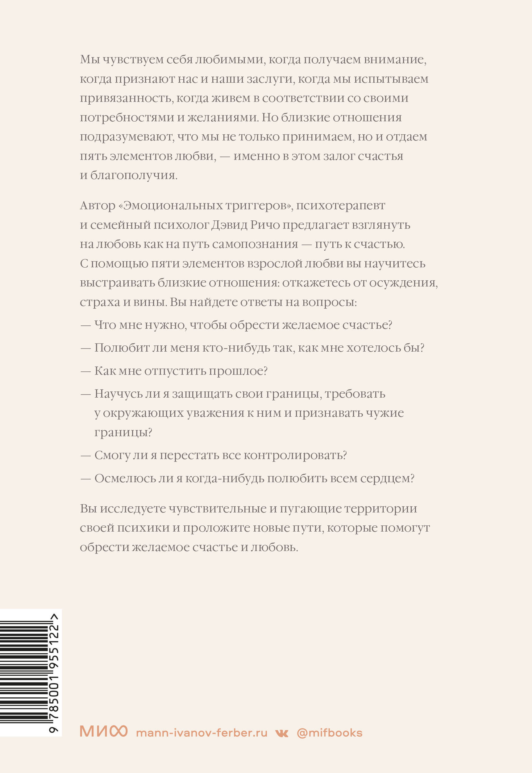 Автор "Эмоциональных триггеров" Дэвид Ричо предлагает свежий взгляд на любовь и отношения - взгляд, который фокусируется не на поиске идеальной пары, а на том, чтобы самому стать более любящим и понимающим человеком. Опираясь на буддийскую концепцию осознанности, автор исследует 5 признаков взрослой любви и того, как они играют ключевую роль в наших отношениях на протяжении всей жизни: 1. Присутствие в настоящем: наблюдение, слушание и отслеживание всех чувств, проявляющихся в наших отношениях. 2. Принятие себя и других. 3. Понимание своих и чужих возможностей, желаний и особенностей. 4. Ощущение привязанности, проявляющееся через объятия и прикосновения. 5. Осознание, что нельзя взять жизнь и любовь под контроль, а нужно принимать их с экстазом и болью, которые они несут в себе. Пять простых тезисов образуют основу зрелой любви. Они помогают нам отойти от осуждения, страха и вины и занять взрослую позицию в отношениях. Это юбилейное издание к 20-летию выхода книги.| Издательство | МАНН, ИВАНОВ И ФЕРБЕР ООО |