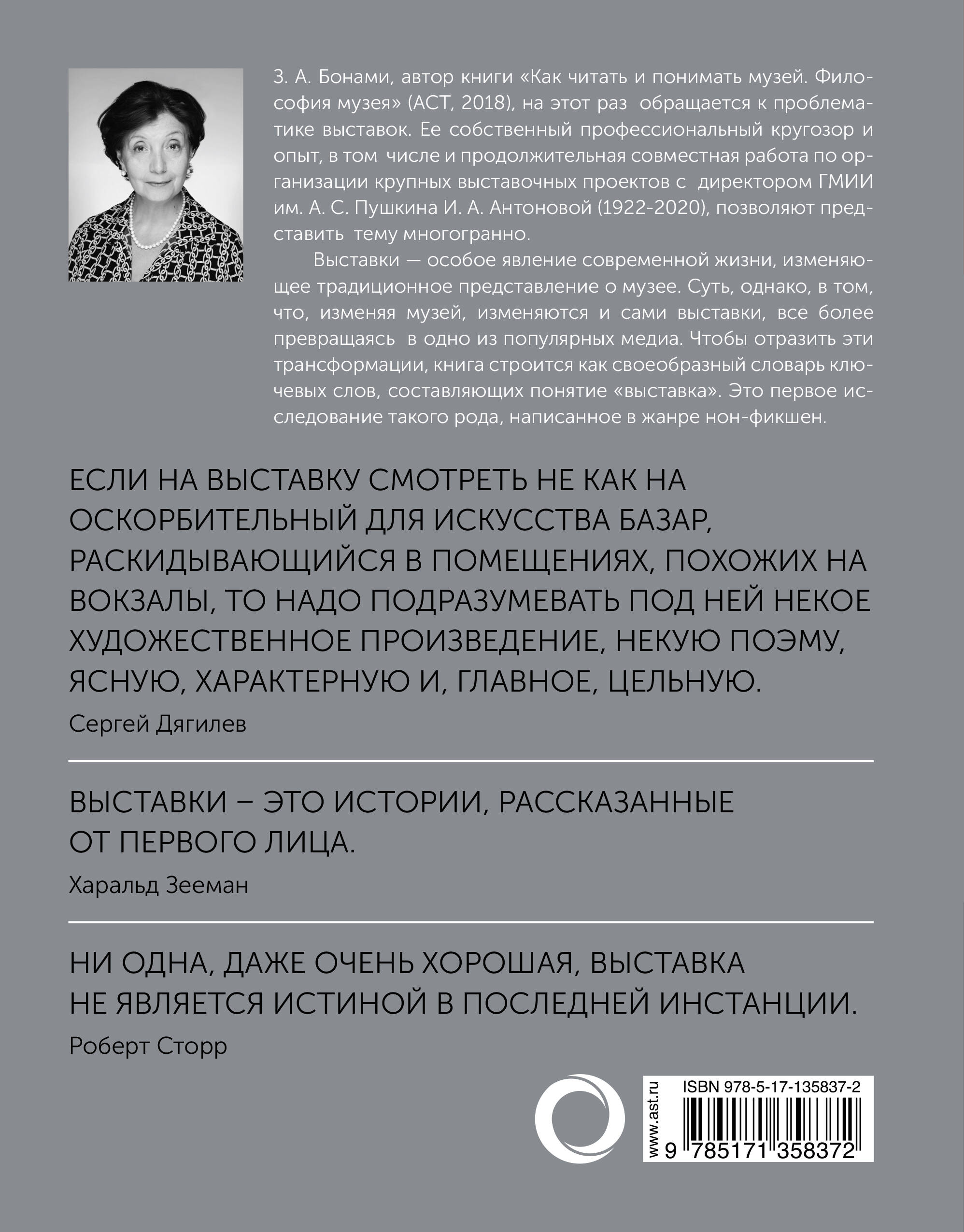 Книга продолжает тему, заявленную в издании: Зинаида Бонами "Как читать и понимать музей. Философия музея", 2018. Автор полагает, что выставки во многом определяют лицо со- временного музея. Исторически они, однако, не только предшествовали первым музеям, но и спо- собствовали их возникновению. Ранние выставки отражали свойственное XVIII веку отношение к материальным предметам как источникам знаний. Значение выставок в XIX веке, прежде всего всемирных, определялось стремлением крупных мировых держав утвердить свое первенство, как в индустриальном развитии, так и в сфере искусства. Популярности выставок в наши дни способствует, так называемый, визуальный поворот, приоритет распространения информации в форме визуальных образов. А также новый принцип организации художественной жизни, основанный на глобальных коммуникациях. Информацион- ная эпоха, однако, изменяет изначальное существо выставки от образовательных целей к медий- ным. Издание содержит разнообразный иллюстративный материал и опирается на солидный практический опыт автора, создателя и организатора многочисленных музейных выставок в Рос- сии и за рубежом.| Издательство | Издательство "АСТ" |