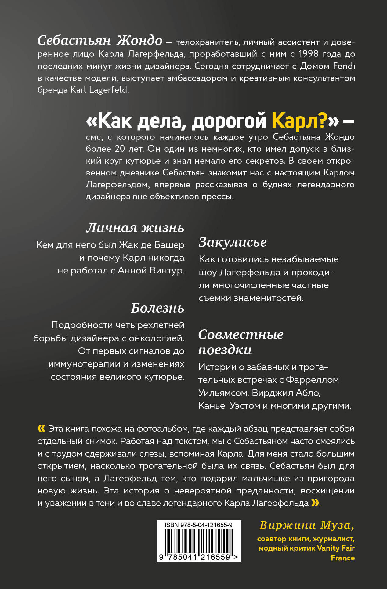 "Как дела, дорогой Карл?" - эсэмэс, с которого начиналось каждое утро Себастьяна Жондо на протяжении более 20 лет. Он один из немногих, кто имел допуск в близкий круг кутюрье и знал немало его секретов. В своем откровенном дневнике Себастьян знакомит нас с настоящим Карлом Лагерфельдом, впервые рассказывая о буднях легендарного дизайнера вне объективов прессы.