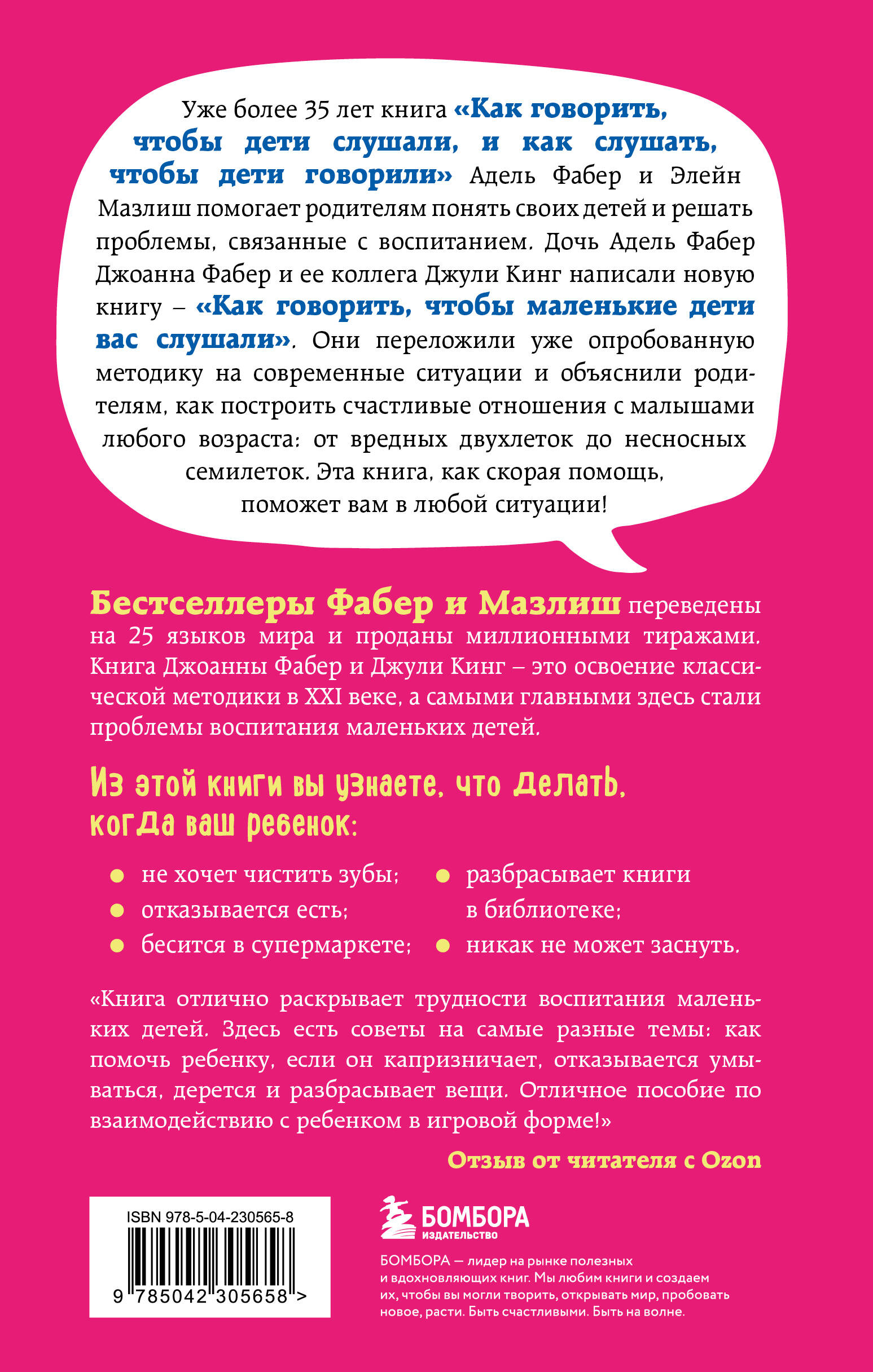 Бестселлеры Фабер и Мазлиш переведены на 25 языков мира и проданы миллионными тиражами. Книга Джоанны Фабер и Джули Кинг «Как говорить, чтобы маленькие дети вас слушали» - это освоение классической методики в XXI веке, а самым главным здесь стали проблемы воспитания маленьких детей. Книга родилась по многочисленным просьбам родителей. Они хотели получить больше примеров и советов по воспитанию именно маленьких детей. Капризные двухлетки, разрушительные трехлетки, невыносимые четырехлетки, отчаянные пятилетки, эгоцентричные шестилетки и семилетки, которые периодически ведут себя как дикари! Эта книга - неиссякаемый источник идей, из которого родители всегда могут что-то почерпнуть, если терпение грозит вот-вот лопнуть! Из этой книги вы узнаете, что делать, когда ваш ребенок: - не хочет чистить зубы; - отказывается есть; - бесится в супермаркете; - разбрасывает книги в библиотеке; - никак не может заснуть.| Издательство | ООО "Издательство "Эксмо" |