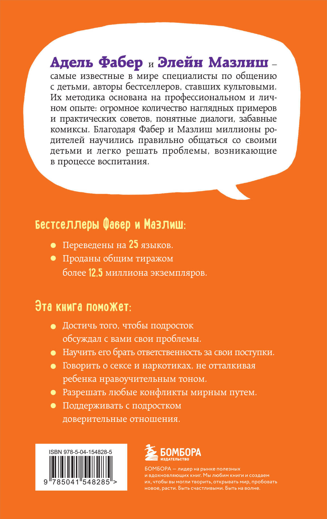 Адель Фабер и Элейн Мазлиш - самые известные в мире специалисты по общению с детьми, авторы бестселлеров, ставших классикой литературы по воспитанию. Их методика основана на профессиональном и личном опыте: большое количество наглядных примеров и практических советов, понятные диалоги, забавные комиксы. Благодаря Фабер и Мазлиш миллионы родителей научились правильно общаться со своими детьми и легко решать проблемы, возникающие в процессе воспитания. Бестселлеры Фабер и Мазлиш: • Переведены на 25 языков. • Проданы общим тиражом более 13 миллионов экземпляров. Эта книга поможет: • Достичь того, чтобы подросток обсуждал с вами свои проблемы. • Научить его брать ответственность за свои поступки. • Говорить о сексе и наркотиках, не отталкивая ребенка нравоучительным тоном. • Разрешать любые конфликты мирным путем. • Поддерживать с подростком доверительные отношения.| Издательство | ООО "Издательство "Эксмо" |