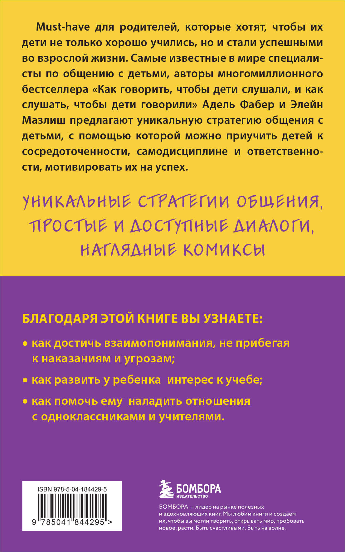 Must-have для родителей, которые хотят, чтобы их дети не только хорошо учились, но и стали успешными во взрослой жизни. Самые известные в мире специалисты по общению с детьми, авторы многомиллионного бестселлера «Как говорить, чтобы дети слушали, и как слушать, чтобы дети говорили» Адель Фабер и Элейн Мазлиш предлагают уникальную стратегию общения с детьми, с помощью которой можно приучить детей к сосредоточенности, самодисциплине и ответственности, мотивировать их на успех. УНИКАЛЬНЫЕ СТРАТЕГИИ ОБЩЕНИЯ, ПРОСТЫЕ И ДОСТУПНЫЕ ДИАЛОГИ, НАГЛЯДНЫЕ КОМИКСЫ. Благодаря этой книге вы узнаете: • как достичь взаимопонимания, не прибегая к наказаниям и угрозам; • как развить у ребенка интерес к учебе; • как помочь ему наладить отношения с одноклассниками и учителями.| Издательство | ООО "Издательство "Эксмо" |