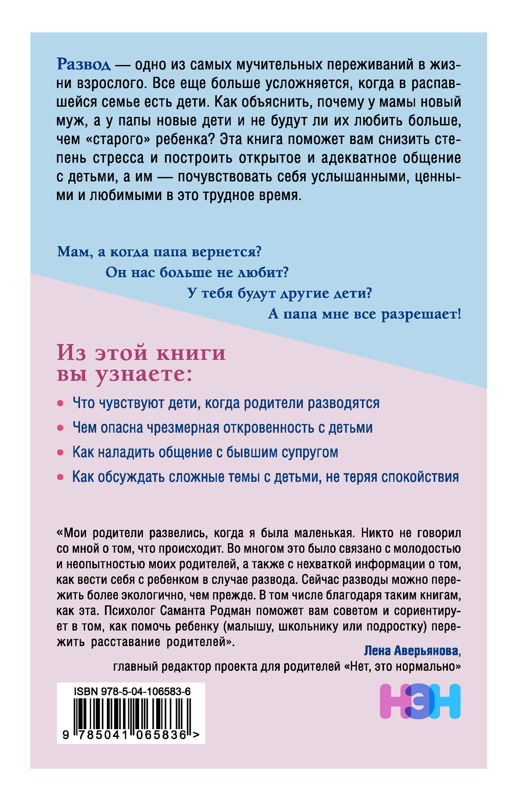 Развод родителей может стать серьезным потрясением для детей. Как позаботиться о них, научить открытому общению и настроить на счастливую жизнь - об этом пишет психолог Саманта Родман. Книга поможет вам: - Правильно спланировать разговор о разводе. - Научить детей не скрывать свои чувства. - Вскрыть личные проблемы, которых вы не замечали. - Построить общение с бывшим супругом. - Различать свои и детские интересы. Дети ни в чем не виноваты. Они заслуживают счастливого детства и здорового будущего. Помогите им.| Издательство | ООО "Издательство "Эксмо" |