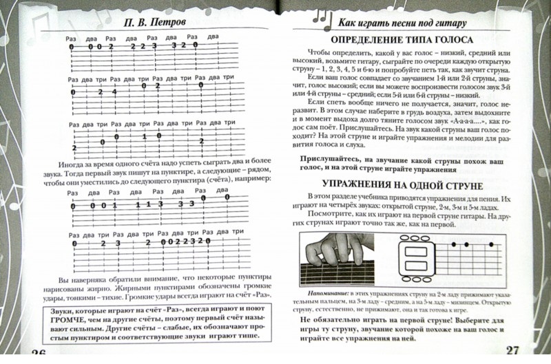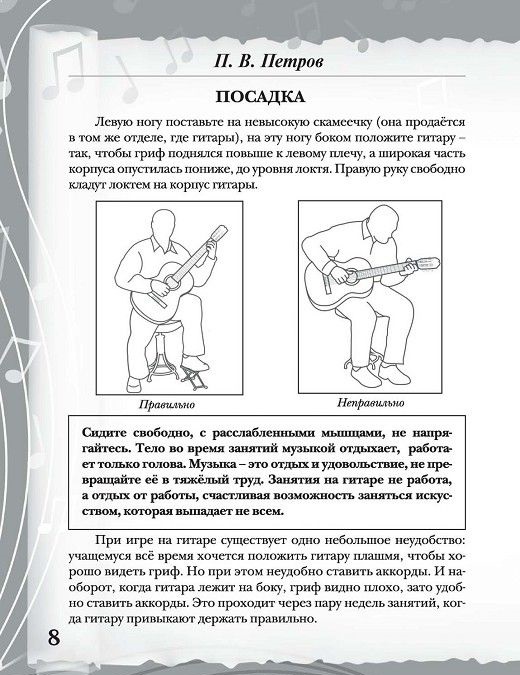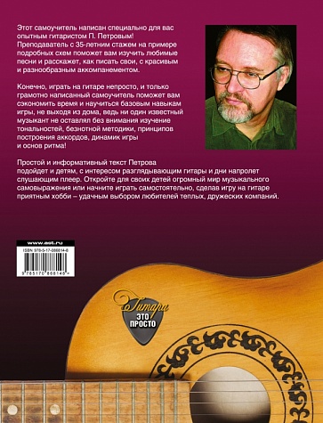 Этот самоучитель написан специально для вас опытным гитаристом П. Петровым! Преподаватель с 35-летним стажем, на примере подробных схем, поможет вам изучить любимые песни и расскажет, как писать свои, с красивым и разнообразным аккомпанементом. Конечно, играть на гитаре не просто и только грамотно написанный самоучитель поможет вам сэкономить время и научится базовым навыкам игры не выходя из дома, ведь ни один известный музыкант не оставлял без внимания изучение тональностей, безнотной методики, принципов построения аккордов, динамике игры и основы ритма! Простой и информативный текст Петрова подойдет и детям, с интересом разглядывающим гитары и дни на пролет слушающими плеер. Откройте для своих детей огромный мир музыкального самовыражения или научитесь играть самостоятельно, сделав игру на гитаре приятным хобби - удачным выбором любителей теплых, дружеских компаний.