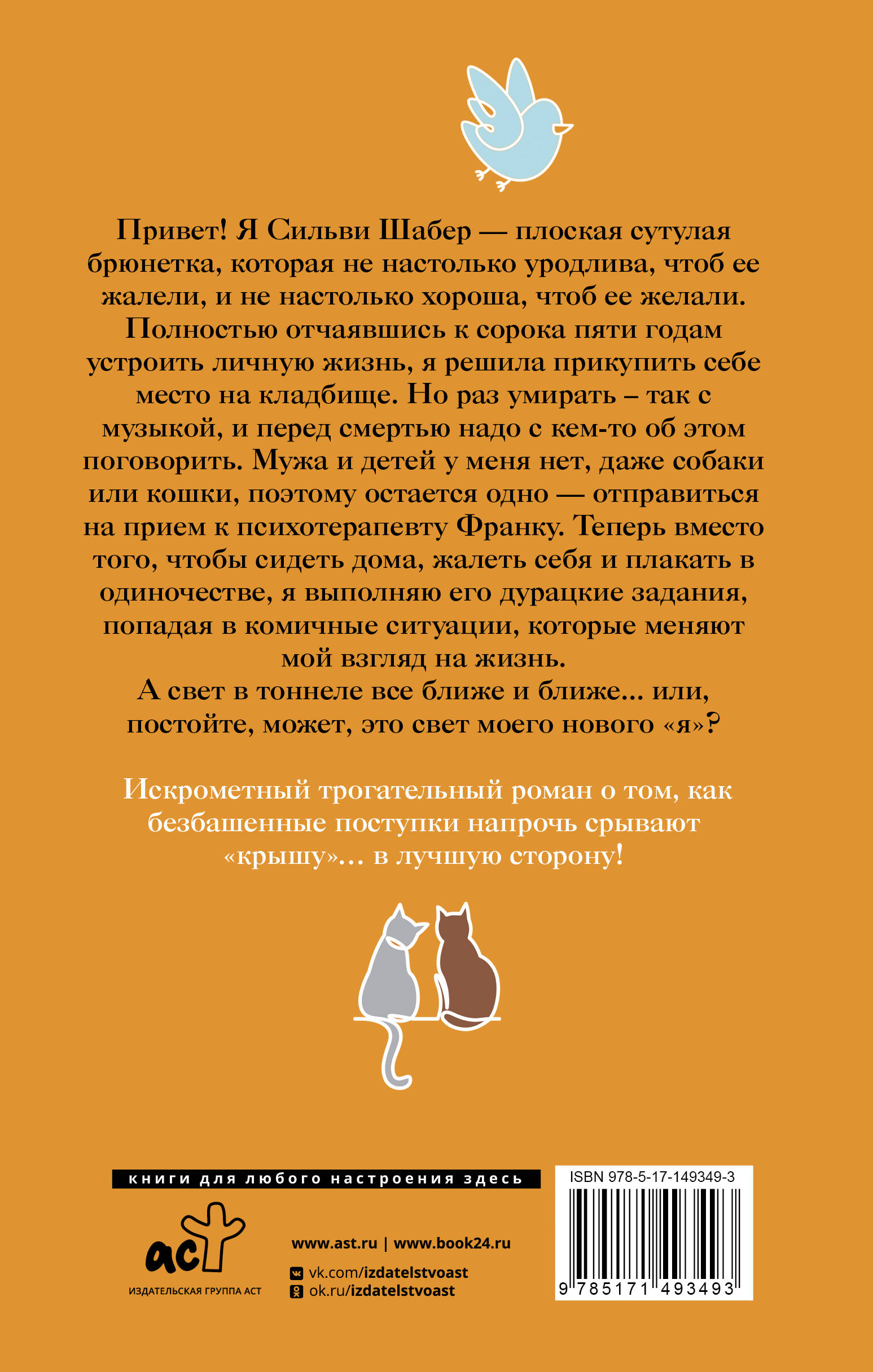 Сильви Шабер - плоская сутулая брюнетка, которая не настолько уродлива, чтоб ее жалели, и не настолько хороша, чтоб ее желали. Полностью отчаявшись к сорока пяти годам устроить личную жизнь, она решила прикупить себе место на кладбище. Но раз умирать - так с музыкой - перед смертью надо с кем-то об этом поговорить, и Сильви отправляется на прием к психотерапевту Франку. С тех пор ее планы идут наперекосяк: вместо того, чтобы сидеть и плакать в одиночестве, женщина, выполняя задания психотерапевта, попадает в комичные ситуации, которые меняют ее взгляд на жизнь и вселяют веру в светлое будущее. Искрометный трогательный роман о том, как безбашенные поступки напрочь срывают "крышу"… в лучшую сторону!| Издательство | ИЗДАТЕЛЬСТВО "АСТ" |