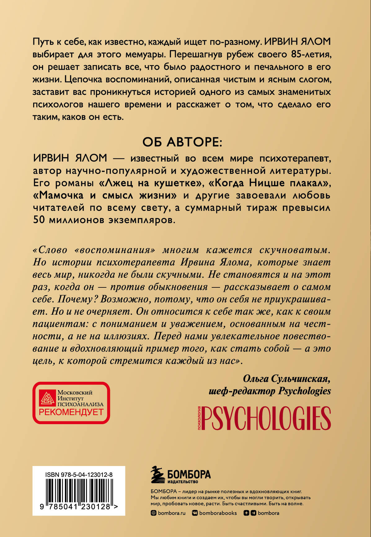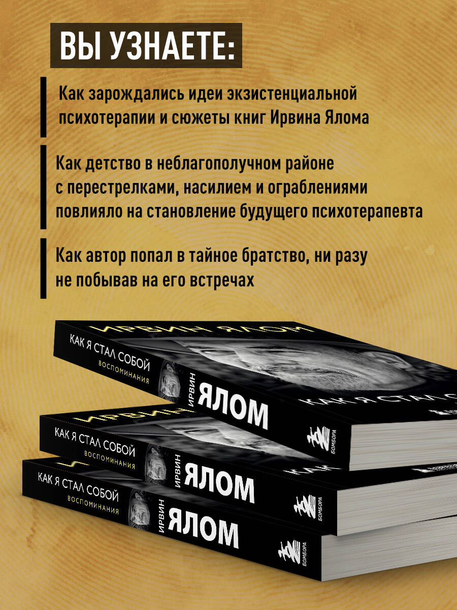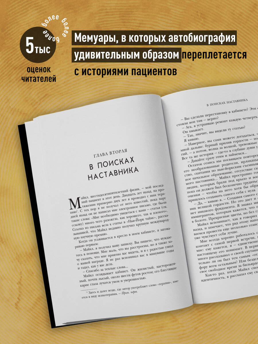 Путь к себе, как известно, каждый ищет по-разному. Ирвин Ялом выбирает для этого мемуары. Перешагнув рубеж своего 85-летия, он решает записать все, что было радостного и печального в его жизни. Цепочка воспоминаний, описанная чистым и ясным слогом, заставит вас проникнуться историей одного из самых знаменитых психологов нашего времени и расскажет о том, что сделало его таким, каков он есть. Об авторе: Ирвин Ялом - известный во всем мире психотерапевт, автор научно-популярной и художественной литературы. Его романы «Лжец на кушетке», «Когда Ницше плакал», «Мамочка и смысл жизни» и другие завоевали любовь читателей по всему свету, а суммарный тираж превысил 50 миллионов экземпляров.| Издательство | ООО "Издательство "Эксмо" |