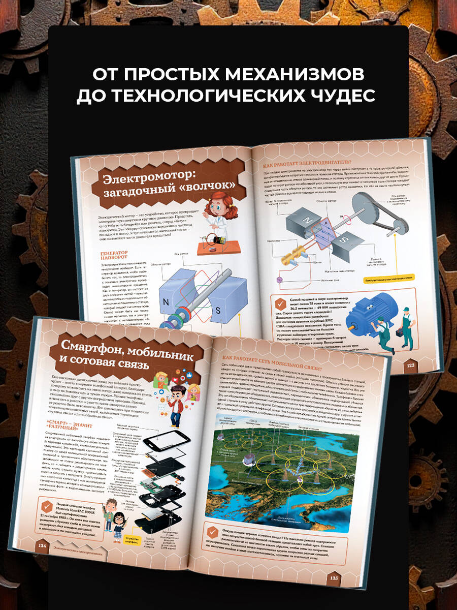 Эта книга раскрывает секреты работы множества устройств, сконструированных человеком на протяжении тысячелетий: от простых механизмов, таких как винт и колесо, замок и велосипед, до настоящих технологических чудес вроде смартфонов и ракетных двигателей. Каждая страница знакомит с детальным исследованием принципов их действия, и что очень важно - все эти выдающиеся изобретения объединяются в группы согласно законам физики, лежащим в основе их конструкции. Таким образом, даже не очень хорошо подкованному в техническом плане читателю легко будет проследить, как базовые природные силы - тяжести, трения, инерции, упругости, давления и другие - заставляют работать современные машины, приборы и аппараты. Показывая глубинную суть окружающих нас вещей, книга дает ответ на один из главных вопросов: как всё устроено? Красочные иллюстрации, понятные схемы и исчерпывающие пояснения делают сложные инженерные концепции доступными даже для детей и подростков. Со страниц книги они узнают, как устроены бытовая техника и электроника, строительные инструменты и энергетические установки, автомобили, самолеты, космические станции и многое-многое другое. Но и это еще не все: с помощью бесплатного приложения на смартфоне или планшете изучаемые объекты можно оживить! Теперь статичные изображения превращаются на экране в 4D-модели, которые можно передвигать и вращать, наблюдая за их работой в реальном времени. Кроме того, это увлекательное действо сопровождается познавательной информацией, которую можно прослушать в звуковом формате. Данное издание не только удовлетворит детское любопытство, но и подтолкнет к более близкому знакомству с техническими науками, что в наше время особенно важно. Для среднего и старшего школьного возраста.| Издательство | Издательство "АСТ" |