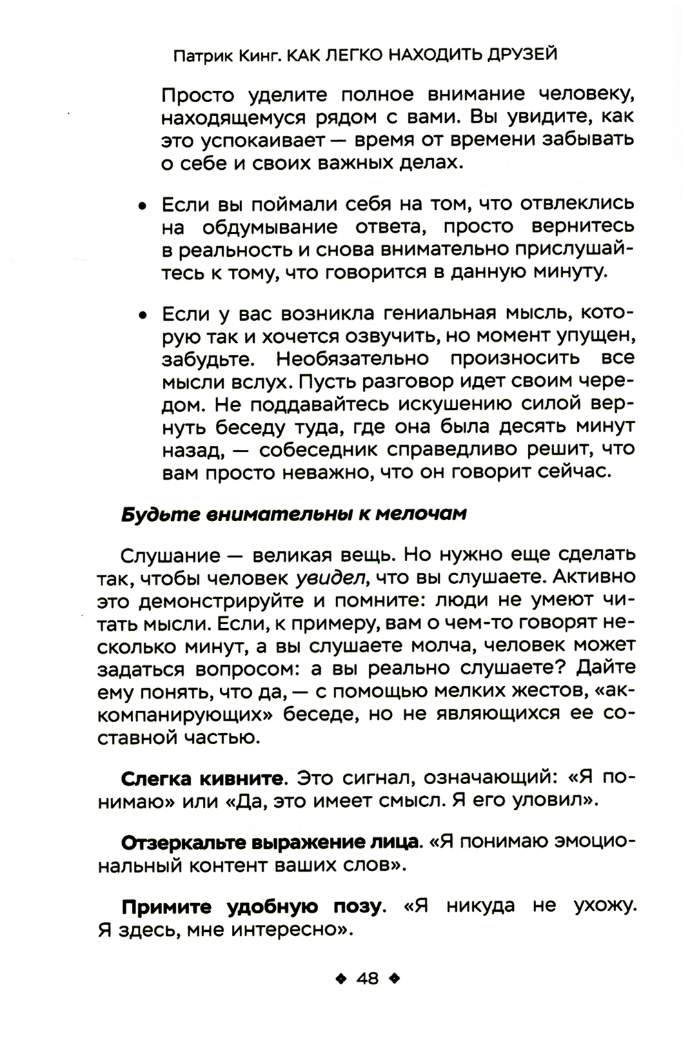 Эта книга научит каждого заводить новых друзей играючи - быстро и эффективно. Нетворкинговые мероприятия? Банкеты? Караоке-вечеринки? Нет проблем. Больше никакой утомительной светской болтовни: налаживать с окружающими тесные контакты - проще простого. Заводить новую дружбу - непростая задача, не правда ли? Но почему так происходит? Слишком много отвлекающих факторов - людям сложно обращать внимание друг на друга. Жизнь бросает очередной вызов - и эта книга помогает достойно на него ответить. В ней рассказано, как уверенно заявлять о себе и привлекать окружающих, как избавляться от пустословия и налаживать прочные долговременные отношения. Стать самой магнетической и притягательной персоной в компании не так уж и сложно. - Формула дружбы, ее пять компонентов и принципы их использования. - Мастерство взаимной любознательности: как подобрать к человеку ключик. - Как помогать людям мыслить вслух. - Структура вопроса, работающего в любой ситуации. - Разговорное «правило трех».| Издательство | Библос |