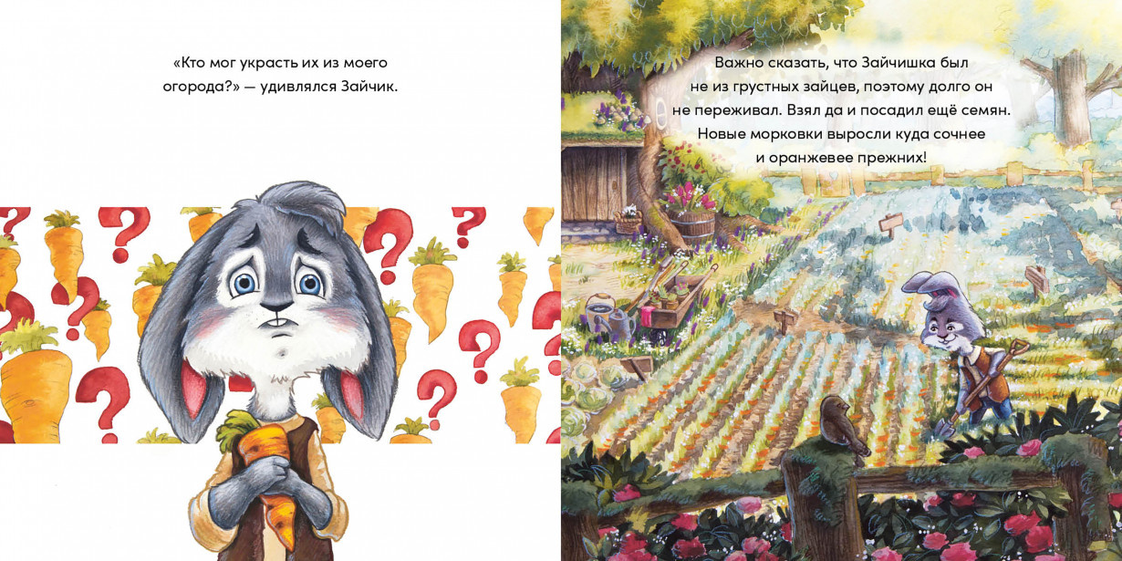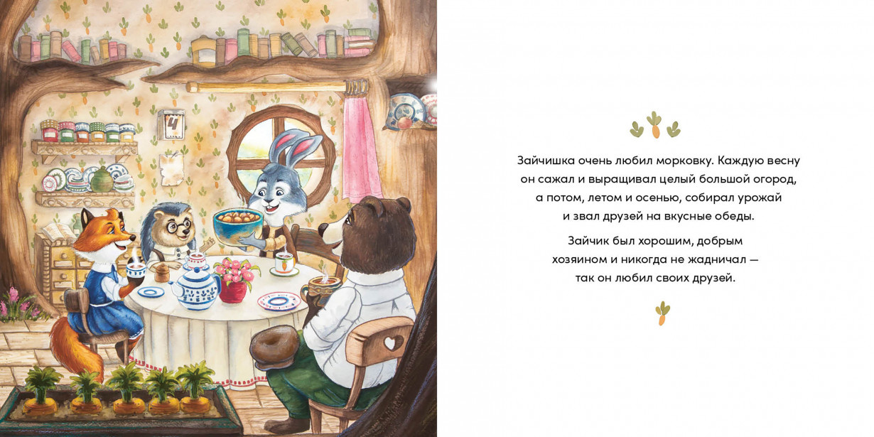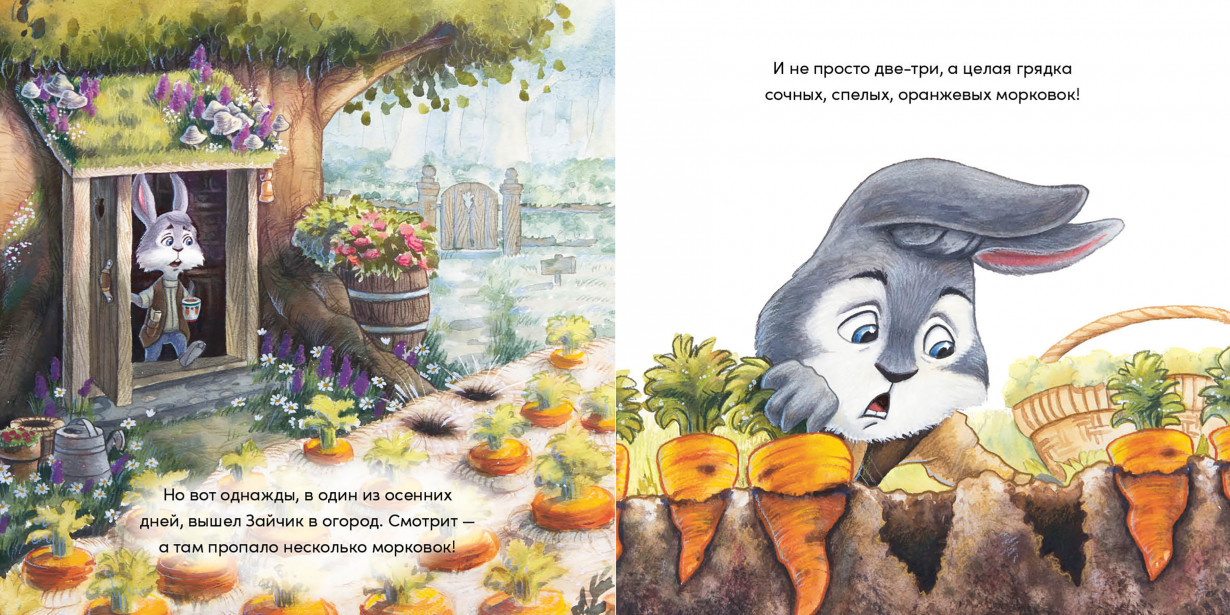 <div class="b-post-content _bookPage"><h2 id="o-chem">О чем</h2><p>Зайчик, лисичка, ёжик и медведь - 4 лесных друга, которые учатся справляться с непростой ситуацией вместе. В процессе рассказа они узнают, что такое неприятность, как можно ее преодолеть с помощью друзей, а также как прощать друзей, если они поступили плохо). </p><p><em>«Но вот однажды, в один из осенних</em></p><p><em>дней, вышел Зайчик в огород. Смотрит -</em></p><p><em>а там пропало несколько морковок!»</em></p><h2 id="osobennosti">Особенности</h2><p></p><ul><li>Рассказ о дружбе</li><li>Учит не делить мир на черное и белое, мир - многогранный и 4 лесных друга выясняют это в процессе рассказа</li><li>Учит прощать тех, кого любишь, помогать и просить о помощи тогда, когда она нужна </li></ul><p></p><br></br><p><em>«Порадоваться тому, что в мире</em></p><p><em>есть друзья, на которых можно</em></p><p><em>положиться, у которых можно учиться,</em></p><p><em>а иногда учить их и помогать им».</em></p><h2 id="dlya-kogo">Для кого</h2><p>Для детей 0+.</p></div>| Издательство | Альпина. Дети |