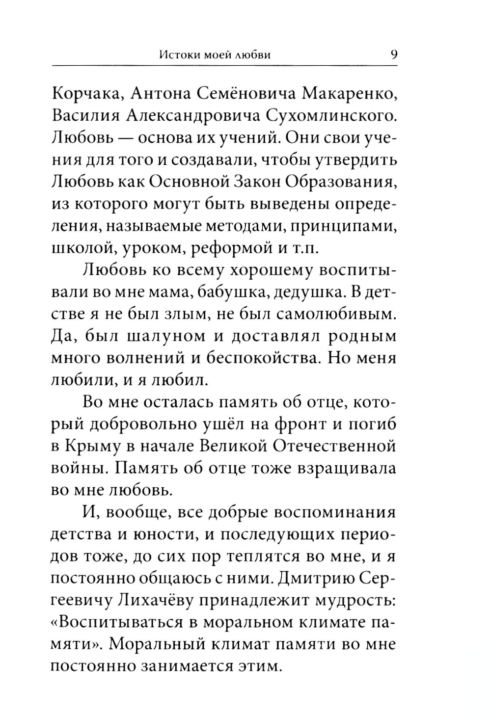 «Я понял, что детей надо любить не только красиво но с чувством глубокой ответственности за их будущее их надо любить всей своей жизнью, надо любить постоянно. А это значит - заботиться о них, о каждом из них не услаждать их байками о«светлом будущем», а вдохнуть в них мужество бороться против тьмы, учить их самим строить, облагораживать жизнь для себя и для других и защитить ее». Таков вывод автора книги, который сделал попытку осмыслить свою богатую педагогическую жизнь с целью проследить за зарождением и становлением в нём любви к детям.| Издательство | Амрита-Русь |