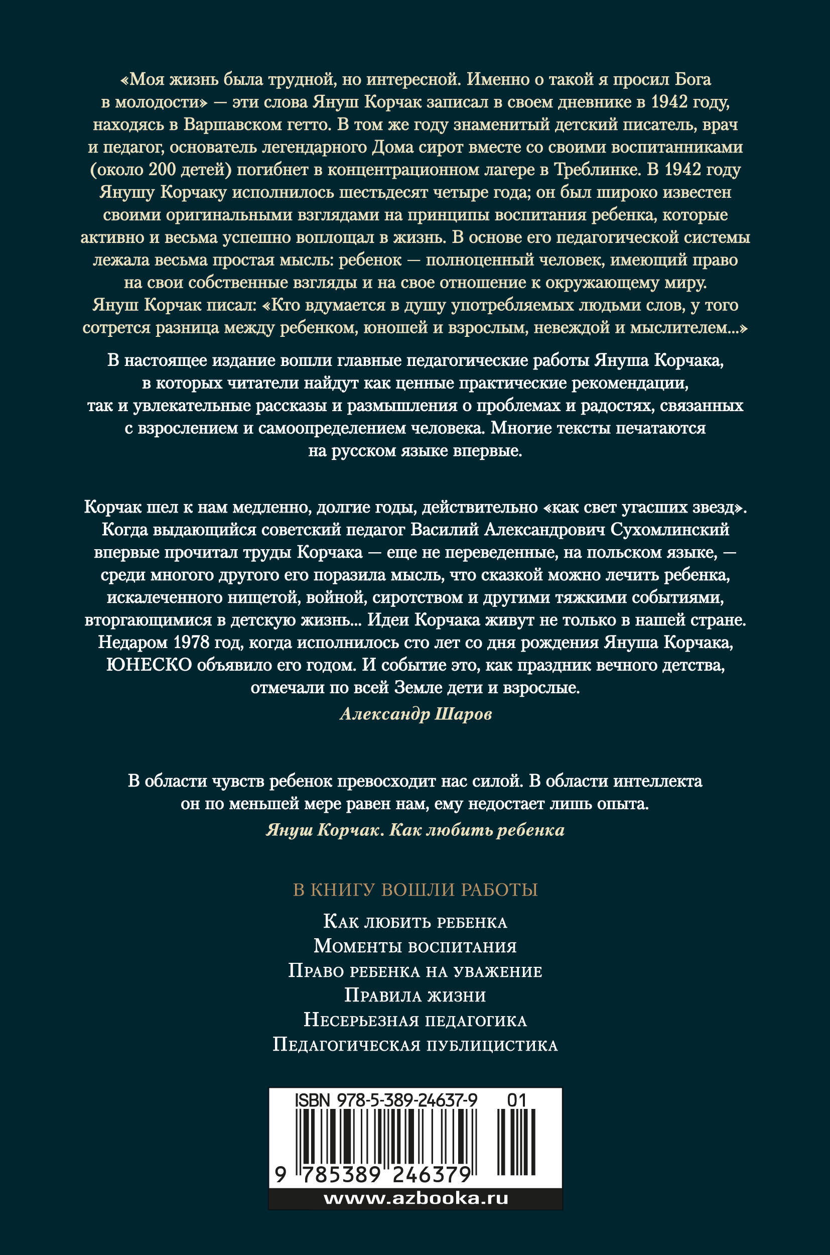"Моя жизнь была трудной, но интересной. Именно о такой я просил Бога в молодости" - эти слова Януш Корчак записал в своем дневнике в 1942 году, находясь в Варшавском гетто. В том же году знаменитый детский писатель, врач и педагог, основатель легендарного Дома сирот вместе со своими воспитанниками (около 200 детей) погибнет в концентрационном лагере в Треблинке. В 1942 году Янушу Корчаку исполнилось шестьдесят четыре года; он был широко известен своими оригинальными взглядами на принципы воспитания ребенка, которые активно и весьма успешно воплощал в жизнь. В основе его педагогической системы лежала весьма простая мысль: ребенок - полноценный человек, имеющий право на свои собственные взгляды и на свое отношение к окружающему миру. Януш Корчак писал: "Кто вдумается в душу употребляемых людьми слов, у того сотрется разница между ребенком, юношей и взрослым, невеждой и мыслителем…" В настоящее издание вошли главные педагогические работы Януша Корчака, в которых читатели найдут как ценные практические рекомендации, так и увлекательные рассказы и размышления о проблемах и радостях, связанных с взрослением и самоопределением человека. Многие тексты печатаются на русском языке впервые.| Издательство | Азбука-Аттикус Издат.группа ООО |
