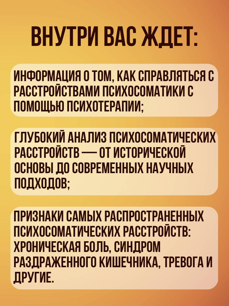 Задумывались когда-нибудь о связи психики и тела? Книга предлагает глубокий анализ психосоматических расстройств, исследуя их историческую основу и современные научные подходы. Вы познакомитесь с эволюцией взглядов на психосоматику, уделяя особое внимание научным попыткам объяснить влияние психики на физическое состояние; с теорией предсказывающего кодирования - одной из самых комплексных современных теорий, объясняющей психосоматические механизмы; с самыми распространенными психосоматическими расстройствами: хроническая боль, синдром раздраженного кишечника, тревога и так далее. А также проанализируете роль семьи в развитии психосоматических проблем. Эта книга предлагает важные инсайты для специалистов, исследователей и всех, кто интересуется взаимосвязью психики и тела.| Издательство | Издательство "АСТ" |