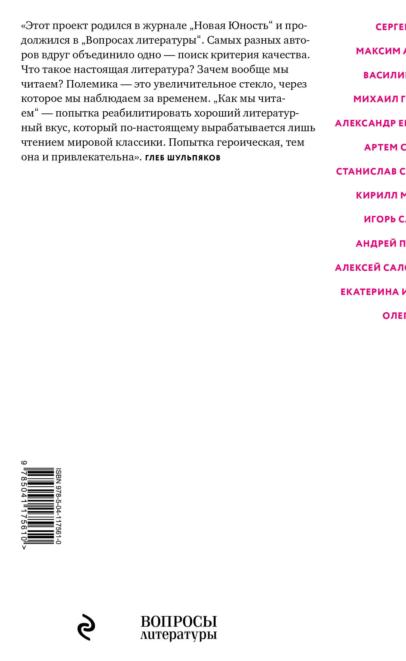 Этот проект родился в журнале "Новая Юность" и продолжился в "Вопросах литературы". Самых разных авторов вдруг объединило одно - поиск критерия качества. Что такое настоящая литература? Зачем вообще мы читаем? Полемика это увеличительное стекло, через которое мы наблюдаем за временем. "Как мы читаем книги" - попытка реабилитировать хороший литературный вкус, который по-настоящему вырабатывается лишь чтением мировой классики. Попытка героическая, тем она и привлекательна. Лаконичная и эффектная книга, в которой собраны эссе известных авторов о практиках чтения в современном мире.| Издательство | ООО "Издательство "Эксмо" |