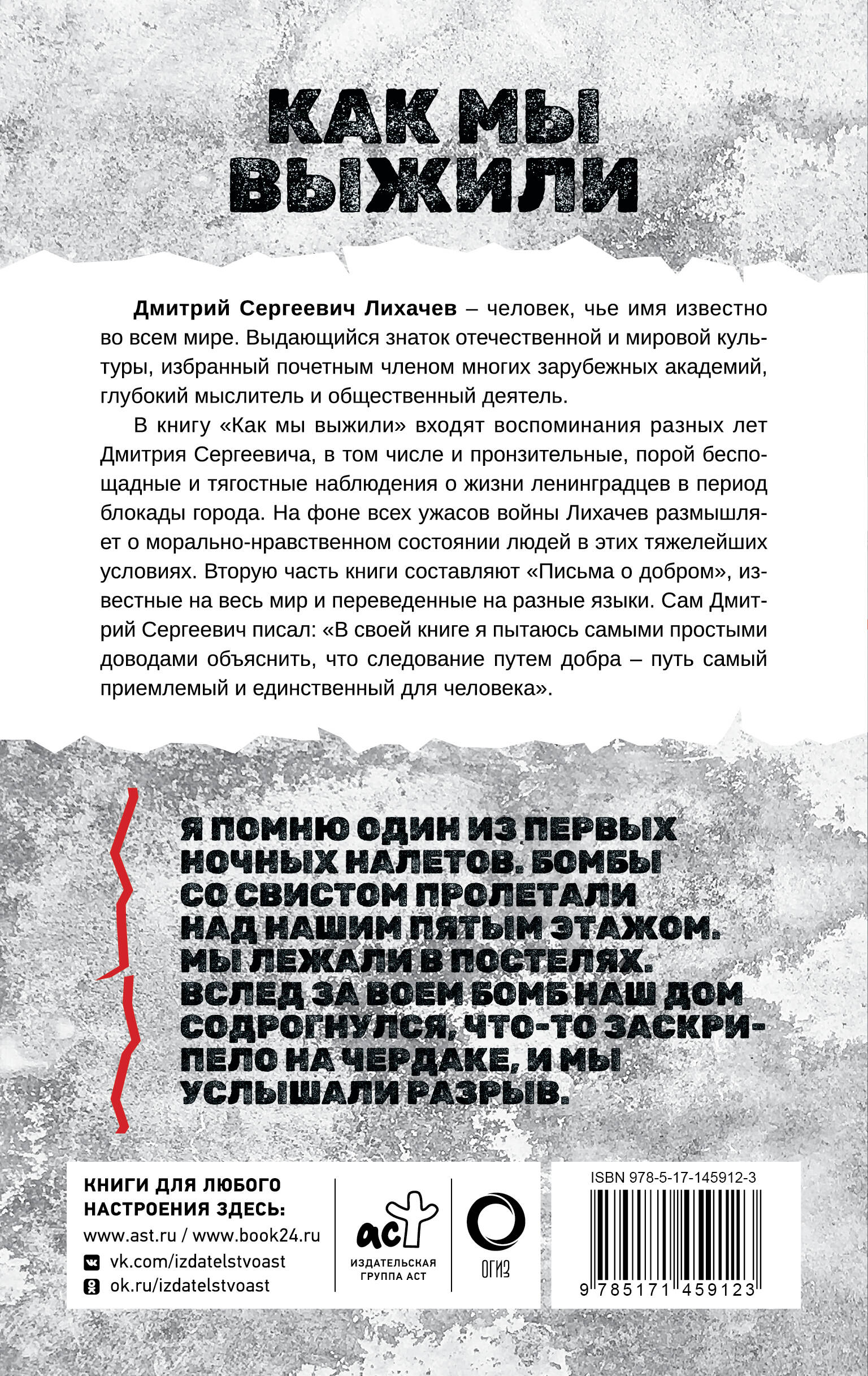 Дмитрий Сергеевич Лихачев - человек, чье имя известно во всем мире. Выдающийся знаток отечественной и мировой культуры, избранный почетным членом многих зарубежных академий, глубокий мыслитель и общественный деятель. В книгу "Как мы выжили" входят воспоминания Дмитрия Сергеевича разных лет, в том числе и пронзительные, порой беспощадные и тягостные наблюдения о жизни ленинградцев в период блокады города. На фоне всех ужасов войны Лихачев размышляет о морально-нравственном состоянии людей в этих тяжелейших условиях.Вторую часть книги составляют "Письма о добром", известные на весь мир и переведенные на разные языки. Сам Дмитрий Сергеевич писал: "В своей книге я пытаюсь самыми простыми доводами объяснить, что следование путем добра - путь самый приемлемый и единственный для человека".| Издательство | ИЗДАТЕЛЬСТВО "АСТ" |