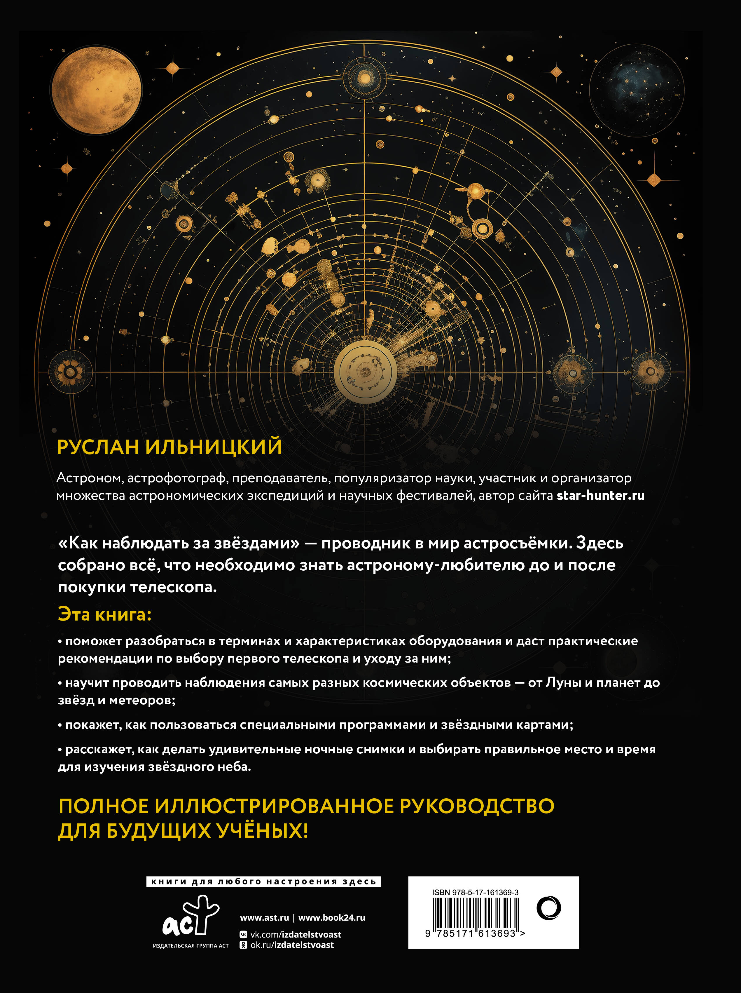 «Как наблюдать за звёздами» - проводник в мир астросъёмки. Здесь собрано всё, что необходимо знать астроному-любителю до и после покупки телескопа. Эта книга: * поможет разобраться в терминах и характеристиках оборудования и даст практические рекомендации по выбору первого телескопа и уходу за ним; * научит проводить наблюдения самых разных космических объектов - от Луны и планет до звёзд и метеоров; *покажет, как пользоваться специальными программами и звёздными картами; * расскажет, как делать удивительные ночные снимки и выбирать правильное место и время для изучения звёздного неба. РУСЛАН ИЛЬНИЦКИЙ - астроном, астрофотограф, преподаватель, популяризатор науки, участник и организатор множества астрономических экспедиций и научных фестивалей, автор сайта star-hunter.ru