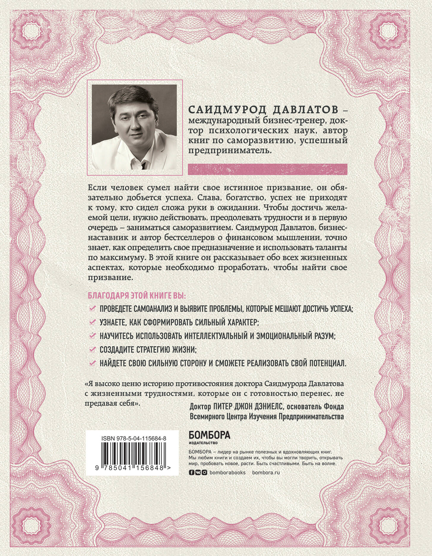 Благодаря этой книге вы: • проведете глубокий самоанализ и выявите проблемы, которые мешают вам стать успешным; • узнаете, как сформировать сильный характер; • научитесь использовать интеллектуальный и эмоциональный разум; • определите свои жизненные ценности; • создадите стратегию жизни; • сможете везде видеть успех. «Я высоко ценю историю противостояния доктора Саидмурода Давлатова с жизненными трудностями, которые он с готовностью перенес, не предавая себя». - Доктор Питер Джон Дэниелс, основатель Фонда Всемирного Центра Изучения Предпринимательства