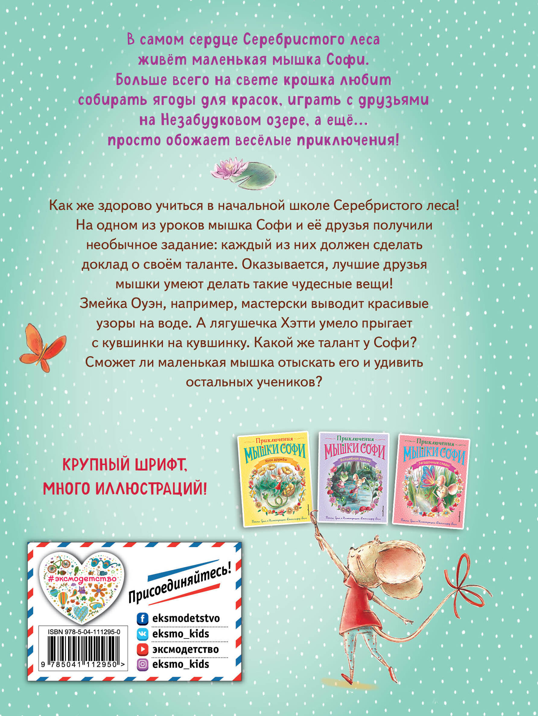 Начальная школа Серебристого леса - удивительное место! В ней так интересно учиться! Мышке Софи и её друзьям придётся потрудиться над необычным заданием: нужно рассказать о своих талантах. Змейка Оуэн, например, выводит хвостиком замысловатые узоры на воде. А лягушечка Хэтти мастерски прыгает с кувшинки на кувшинку. Что же лучше всего получается у Софи? Сможет ли мышка отыскать свой талант и поразить других учеников? Книга отлично подойдёт для первого самостоятельного чтения: крупный шрифт, удобный формат, простой, увлекательный сюжет. История дополнена милыми чёрно-белыми иллюстрациями Дженнифер Белл, которая оформила более 40 детских книг. Эта добрая история поможет ребёнку справиться со своими страхами и поверить в то, что у каждого есть талант!| Издательство | ООО "Издательство "Эксмо" |