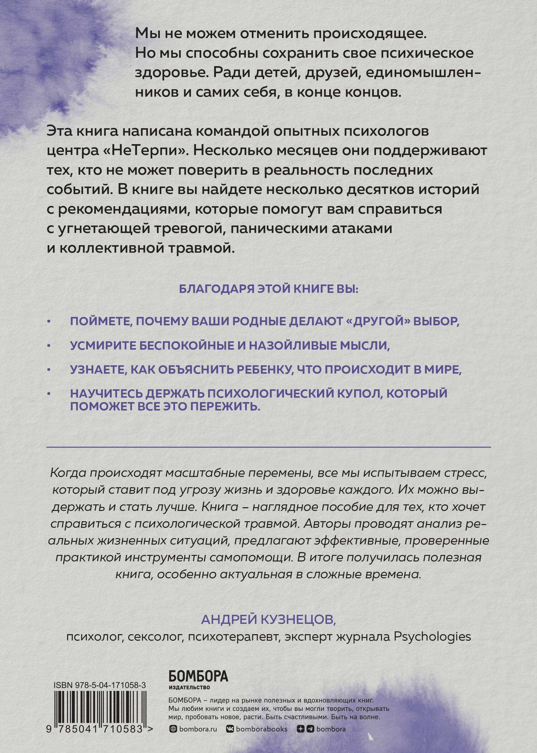 Мы не можем отменить происходящее. Но мы способны сохранить свое психическое здоровье. Ради детей, друзей, единомышленников и самого себя, в конце концов. Эта книга написана командой опытных психологов Центра «НеТерпи». Несколько месяцев они поддерживают тех, кто не может поверить в реальность последних событий. В книге вы найдете несколько десятков историй с рекомендациями, которые помогут вам справиться с угнетающей тревогой, паническими атаками и коллективной травмой. Благодаря этой книге вы: - поймете, почему ваши родные делают «другой» выбор, - усмирите беспокойные и назойливые мысли, - узнаете, как объяснить ребенку, что происходит в мире, - научитесь держать психологический купол, который поможет все это пережить.| Издательство | ООО "Издательство "Эксмо" |