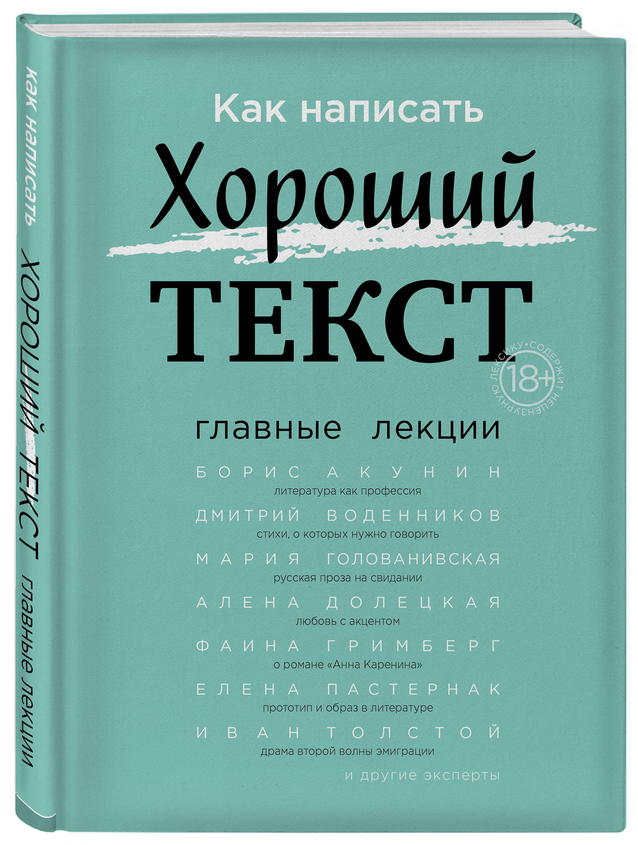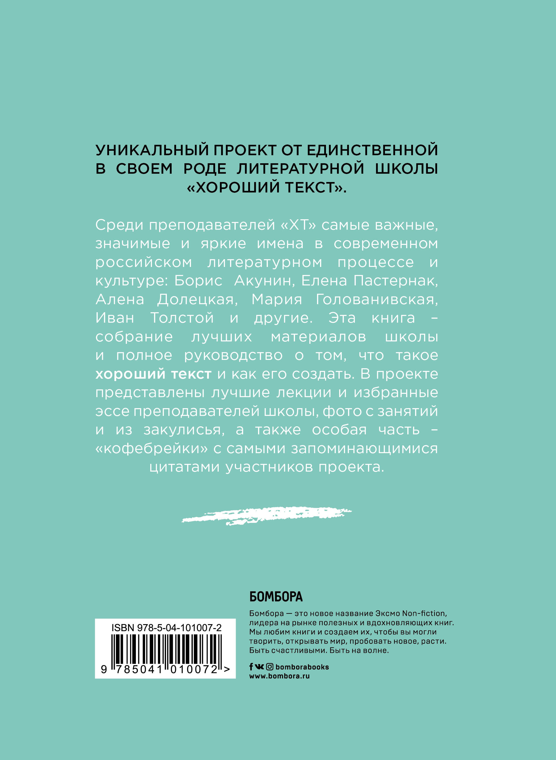 Уникальный проект от единственной в своем роде литературной школы "Хороший текст". Среди преподавателей "ХТ" самые важные, значимые и яркие имена в современном российском литературном процессе, кино и культуре. Это Борис Акунин, Елена Пастернак, Алена Долецкая, Мария Голованивская, Дмитрий Воденников и другие. Эта книга - собрание лучших материалов школы и полное руководство о том, что такое по-настоящему Хороший Текст и как его создать.В проекте представлены лучшие лекции преподавателей школы, фото с лекций и из "закулисья", а также особая часть - "кофебрейки" с самыми запоминающимися цитатами участников проекта.| Издательство | ООО "Издательство "Эксмо" |