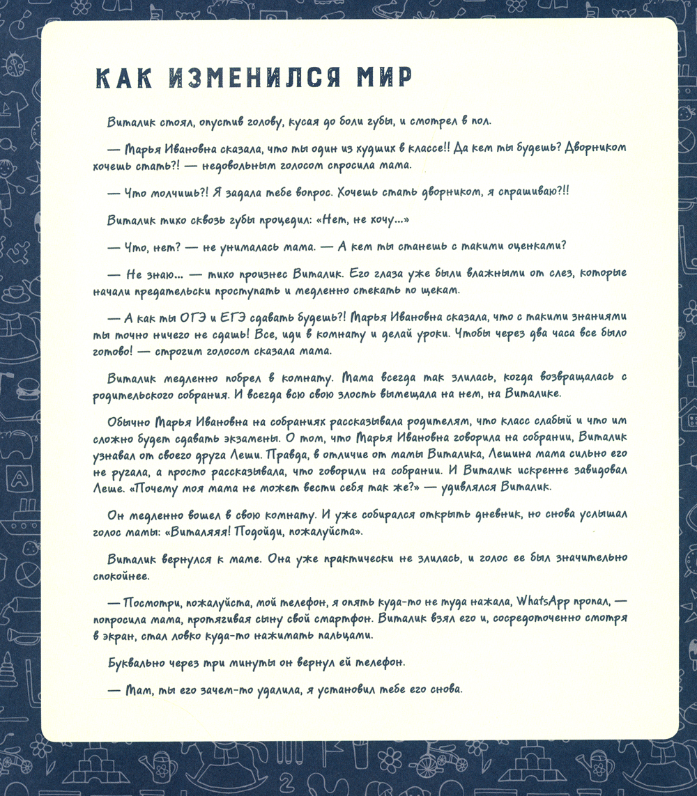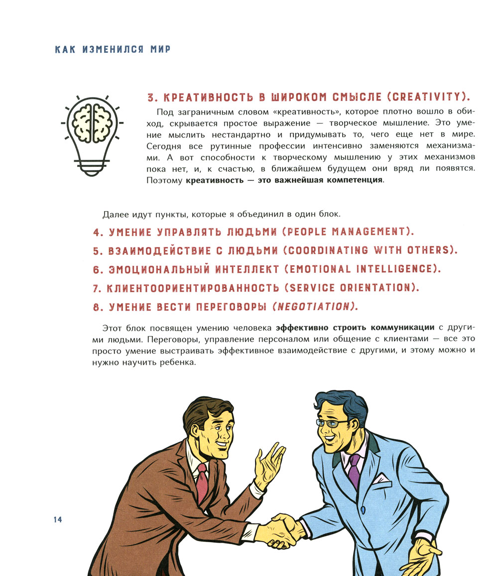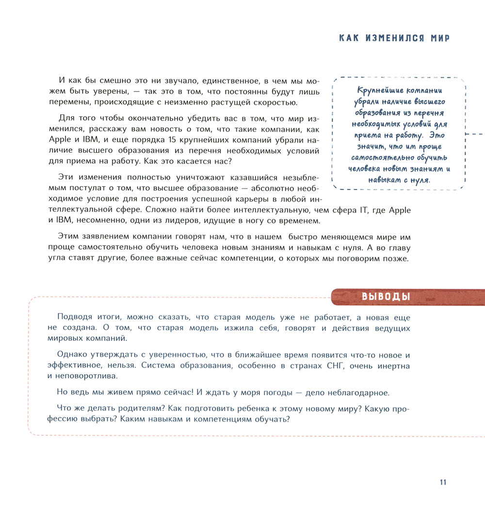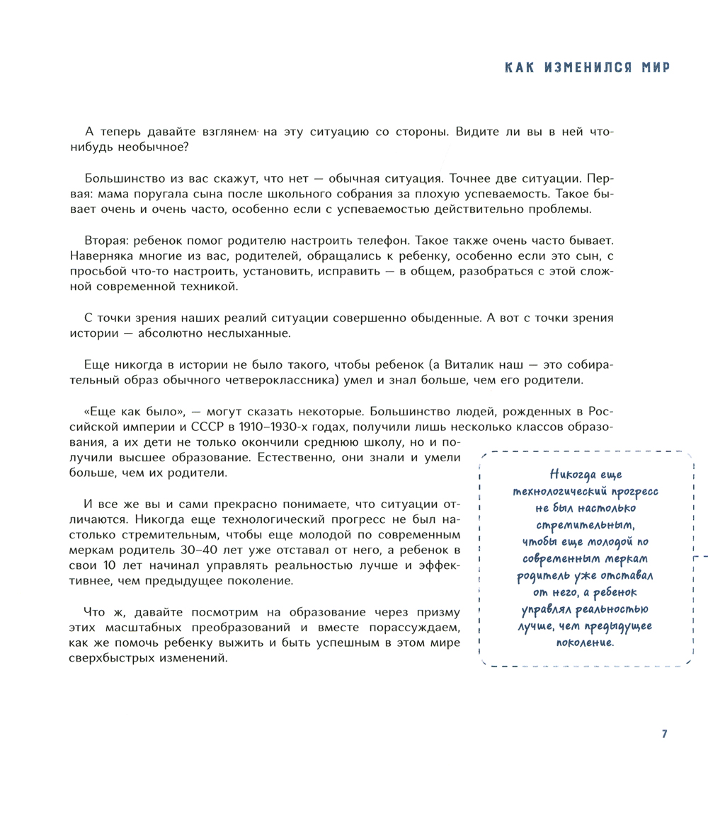 Быть успешным в современном мире - совсем не то же, что 300 лет назад. Мир меняется значительно быстрее, чем мы успеваем заметить. Профессии появляются и исчезают одна за другой. Поэтому у мыслящего родителя возникает вопрос: как подготовить ребенка к будущему? Какие навыки и компетенции понадобятся ему через десять лет и чему учить его уже сегодня? Исходя из современных реалий, автор рассматривает компетенции, которые будут актуальны в будущем, и дает практические упражнения по их тренировке. В этой книге собраны основные приемы, способы и принципы эффективного обучения. Они упростят процесс обучения, но помогут получить более полные и структурные знания по школьным предметам, тратя на это меньше времени. Книга предназначена для родителей школьников и детей старшего дошкольного возраста.| Издательство | ИД "Нева" |