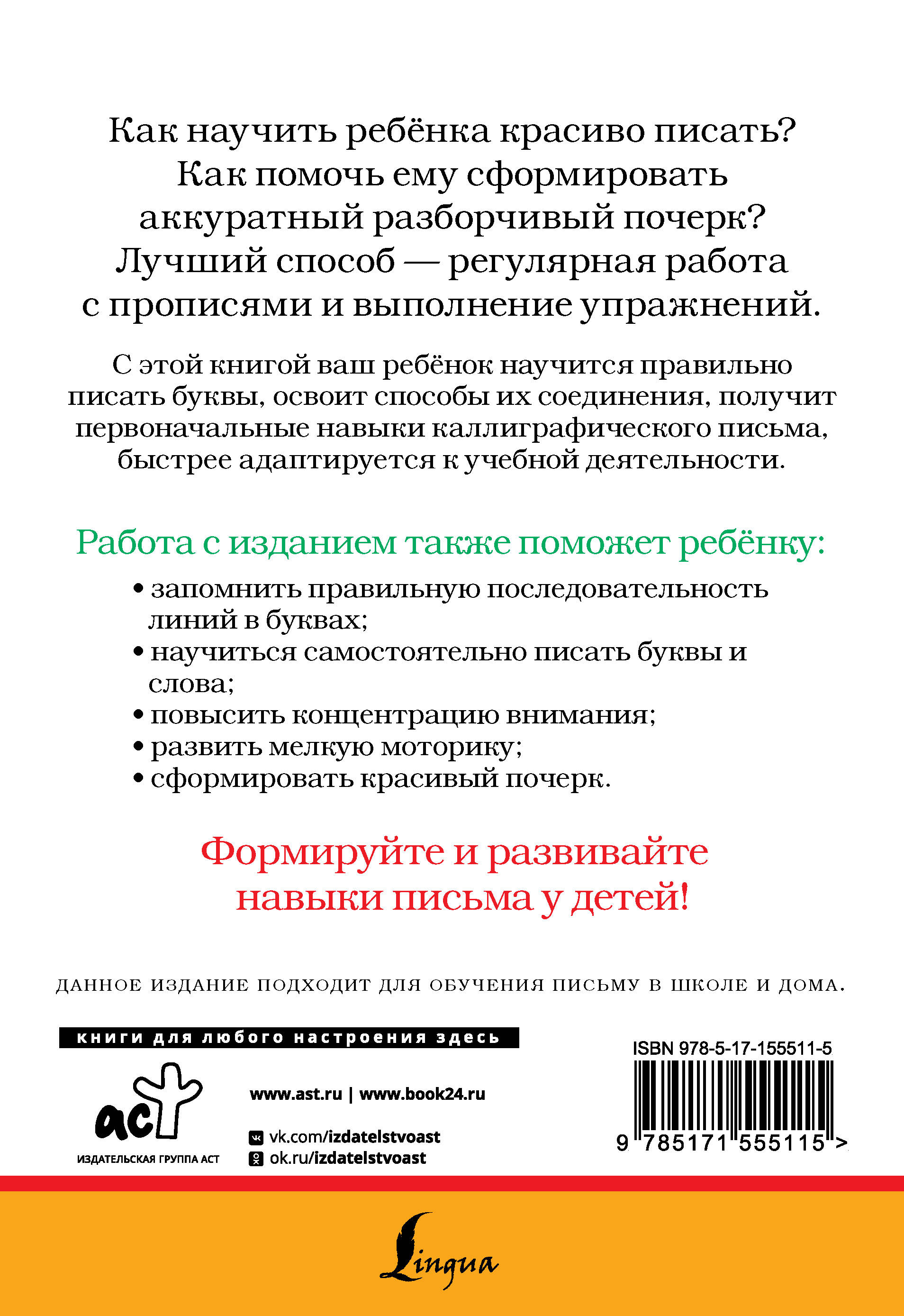 Как научить ребёнка красиво писать? Как сформировать у него аккуратный разборчивый почерк? Эти прописи станут незаменимым помощником для вас и ваших детей. В издании представлены плавные и кривые линии, палочки, крючки, фрагменты картинок, буквы русского алфавита со стрелками, показывающими направление линий, а также сочетания букв, слова и предложения. Регулярная работа с пособием помогает формировать зрительный образ букв и красивый почерк, развивать графические навыки и мелкую моторику, предупреждать нарушения письма, координировать движения руки, быстрее адаптироваться к учебной деятельности. Прописи соответствуют требованиям ФГОС (Федерального государственного образовательного стандарта) и подходят к любым учебникам русского языка. Издание удобного формата предназначено для учащихся начальной школы, учителей и родителей, а также может быть полезно при подготовке детей к школе.| Издательство | ИЗДАТЕЛЬСТВО "АСТ" |