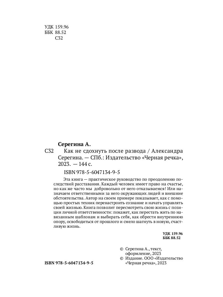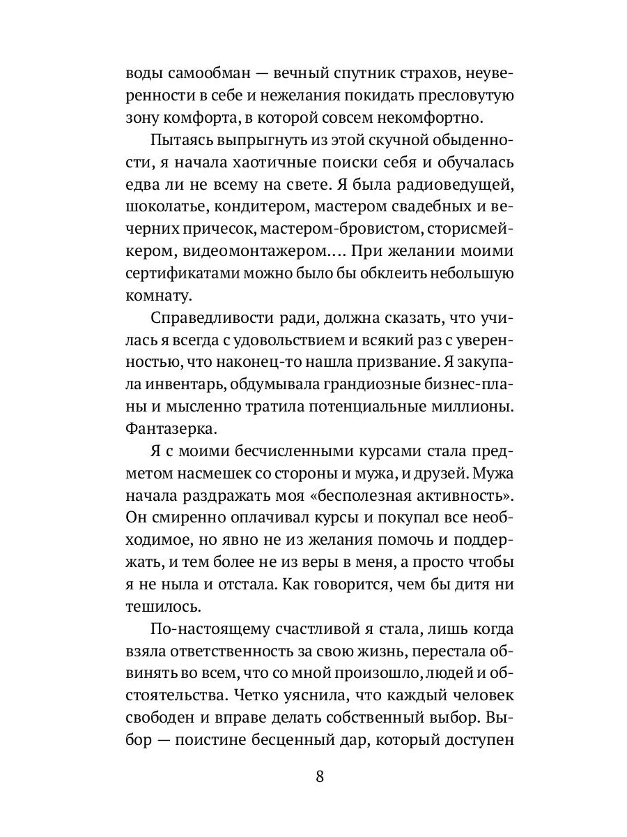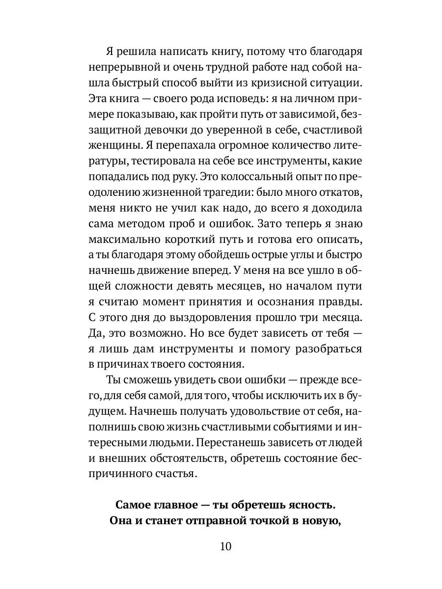 Эта книга - практическое руководство по преодолению последствий расставания. Каждый человек имеет право на счастье, но как же часто мы добровольно от него отказываемся! Или назначаем ответственными за него окружающих людей и внешние обстоятельства. Автор на своем примере показывает, как с помощью простых техник перенастроить сознание и начать управлять своей жизнью. Книга позволит пересмотреть свою жизнь с позиции личной ответственности: покажет, как перестать жить по навязанным шаблонам и выбирать себя, как обрести внутреннюю опору, освободиться от прошлого и смело шагнуть в новую, счастливую жизнь.| Издательство | Черная речка |