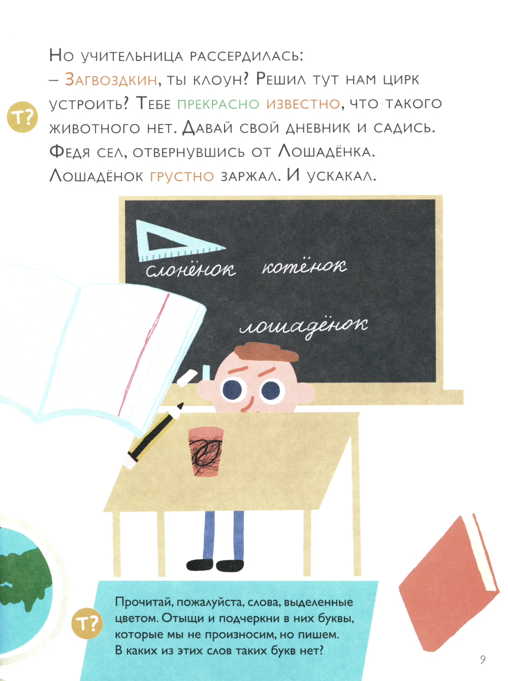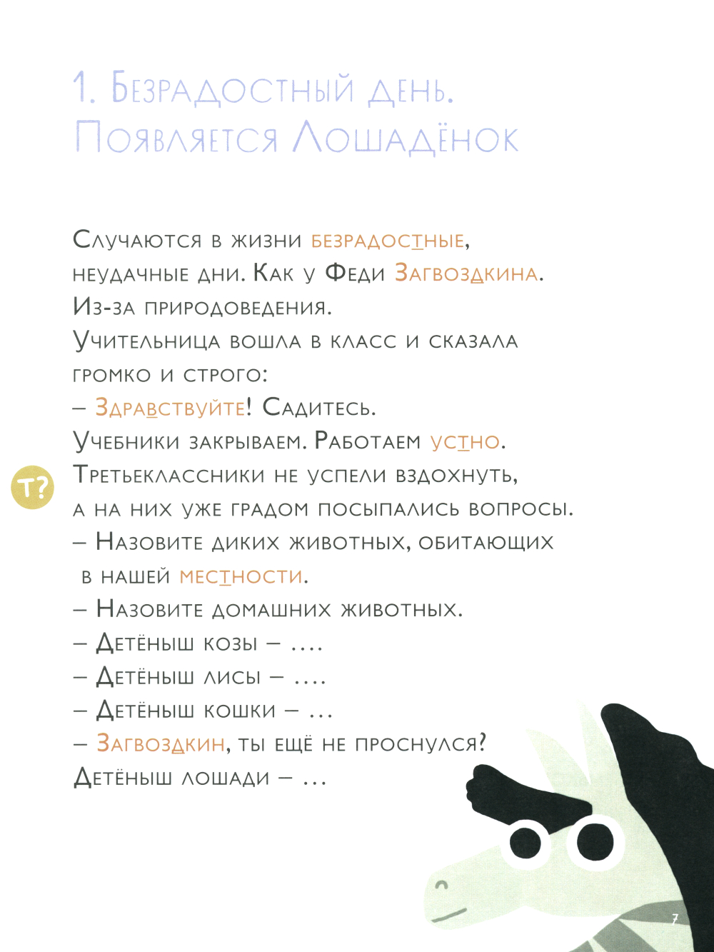 Вместе с бабушкой и мамой повторяю орфограммы! Как помочь своему младшекласснику запомнить и научиться применять правила правописания непроизносимых согласных в корне слова? Поможет книга - рабочая тетрадь «Как несчастный Лошадёнок стал счастливым». У третьеклассника Феди замечательная фамилия - Загвоздкин. Ведь в ней скрывается гвоздь. Однажды на уроке природоведения Федя случайно придумал Лошадёнка. Только вот учительница ужасно рассердилась и сказала, что такого животного нет. И Федин Лошадёнок из-за этого стал очень несчастным. Как же всё исправить и помочь ему? Федя решает обратиться в Агентство чудесных превращений...| Издательство | Альпина Паблишер |