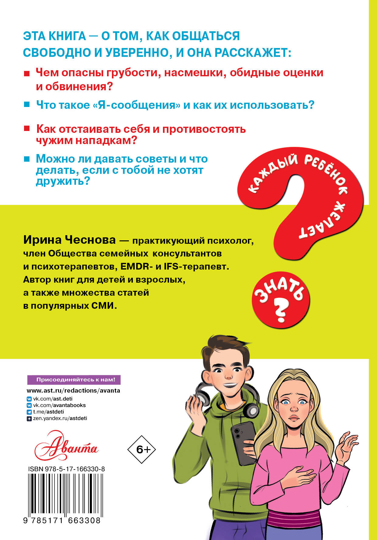 В своей новой книге известный психолог Ирина Чеснова раскроет юным читателям - младшим и средним школьникам - все секреты общения. Книга подскажет, как быть доброжелательным, но твердым, отстаивать свои интересы, реагировать на грубости, разрешать конфликты, говорить "нет" - в общем, как общаться свободно и уверенно, оставаясь при этом собой. А также как развивать отношения с тем, кто нравится, и не бояться говорить о том, что на душе. Для младшего и среднего школьного возраста.| Издательство | Издательство "АСТ" |