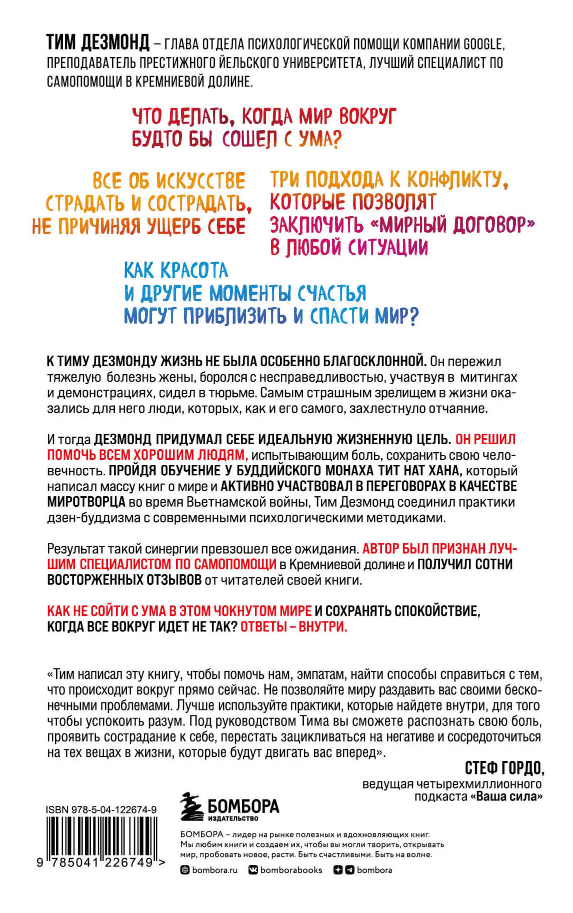 Книга главы отдела психологической помощи GOOGLE Тима Дезмонда отвечает на вопрос, что делать, когда мир вокруг будто бы сошел с ума. Почему одни люди отравляют жизнь другим? С какой стати деньги и власть находятся в руках у избранных? Как предотвратить то, что Земля уже через сотню лет может стать непригодной для жизни? Обо всем этом размышлял автор, сидя в тюремной камере. К Тимоти Дезмонду жизнь не была особенно благосклонной: он пережил тяжелую болезнь жены, боролся с несправедливостью, участвуя в протестном движении. Но самым страшным зрелищем ему всегда представлялись добрые люди, которых захлестнуло отчаяние. Дезмонд придумал себе идеальную жизненную цель: попытаться сделать мир лучше, чем он был до его рождения, и помочь всем хорошим людям, испытывающим боль и страдания, сохранить свою человечность. Пройдя обучение у буддийского монаха и духовного лидера Тит Нан Хана, соединив практики дзэн-буддизма и медитации с современными психологическими методиками, он изобрел свой способ жить спокойно, гармонично и счастливо, - оставаясь человеком, сострадая и помогая другим. Сегодня Тимоти Дезмонд считается лучшим специалистом по самопомощи в Силиконовой долине и знает, как сохранить равновесие и вкус жизни в нашем совершенно безумном, но все же прекрасном мире. Книга будет интересна тем, кто хочет знать: - Как оставаться человеком, когда все бесит. - Как стать бесстрашным. - Как исцелиться от душевной боли.| Издательство | ООО "Издательство "Эксмо" |