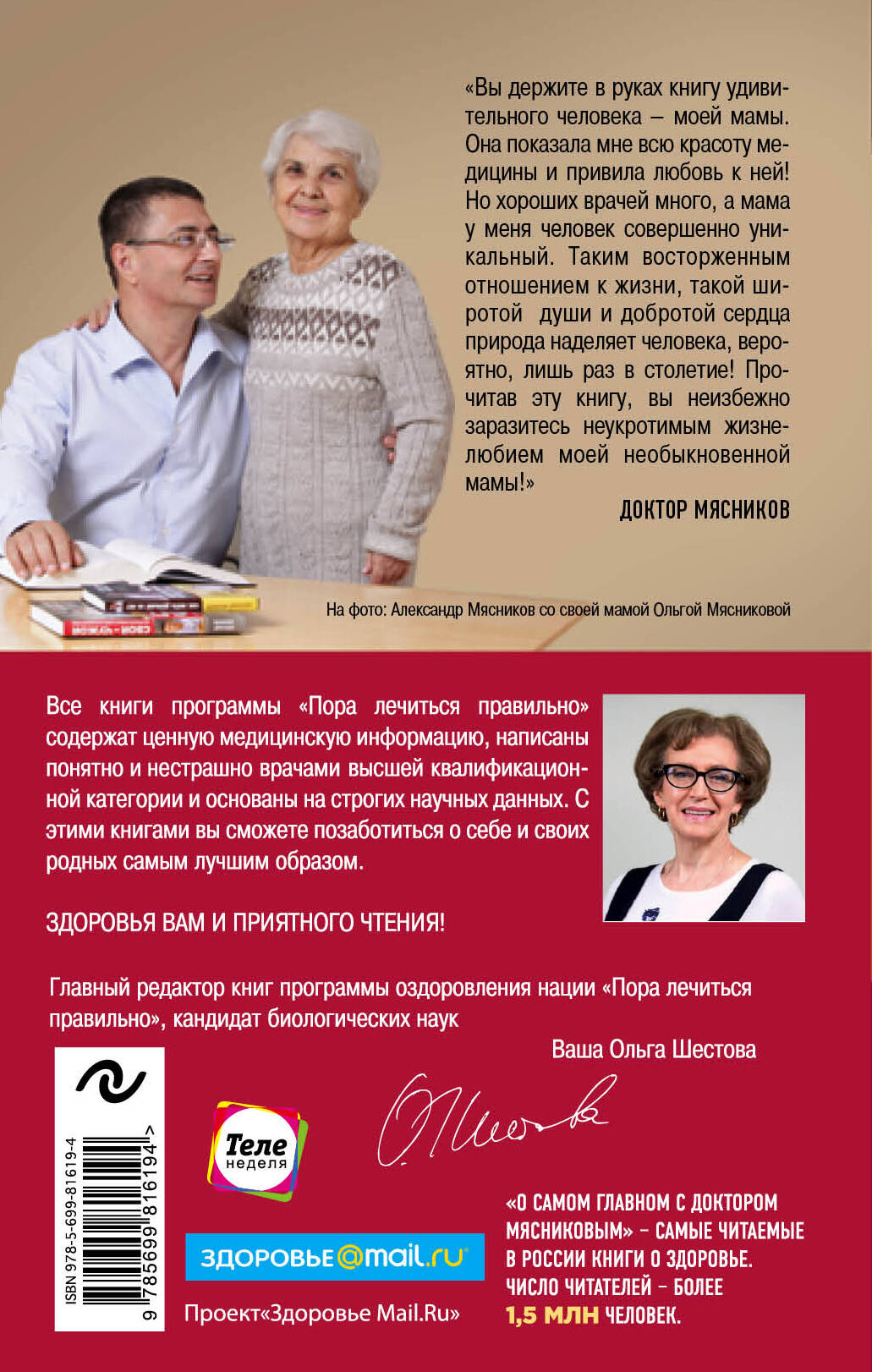 Автор этой книги - уникальный во многих отношениях. Во-первых, Ольга Мясникова - мама, вырастившая знаменитого сына, известного всем как доктор Александр Мясников. Во-вторых, она доктор, который продолжает прием больных в свои 88 лет. В-третьих, Ольга Мясникова - жена сына знаменитого академика Александра Леонидовича Мясникова и, соответственно, его невестка, которая приоткрывает с бытовой стороны жизнь знаменитой врачебной династии. Ну а в-четвертых, она - настоящая красивая женщина. Возможно, именно так хотели бы выглядеть в ее годы многие и многие девушки. Она расскажет, как этого возможно добиться. «Вы держите в руках книгу удивительного человека - моей мамы. Она показала мне всю красоту медицины и привила любовь к ней! Но хороших врачей много, а мама у меня человек совершенно уникальный. Таким восторженным отношением к жизни, такой широтой души и добротой сердца природа наделяет человека, вероятно, лишь раз в столетие! И это не только мое мнение - так говорят все, кто с ней общается, а на ее жизненном пути встречались совершенно незаурядные люди. Прочитав эту книгу, вы наполнитесь энергией, вы поймете, что ничего и никогда не поздно, вы неизбежно заразитесь неукротимым жизнелюбием моей необыкновенной мамы! Ваш Доктор Мясников».| Издательство | ООО "Издательство "Эксмо" |