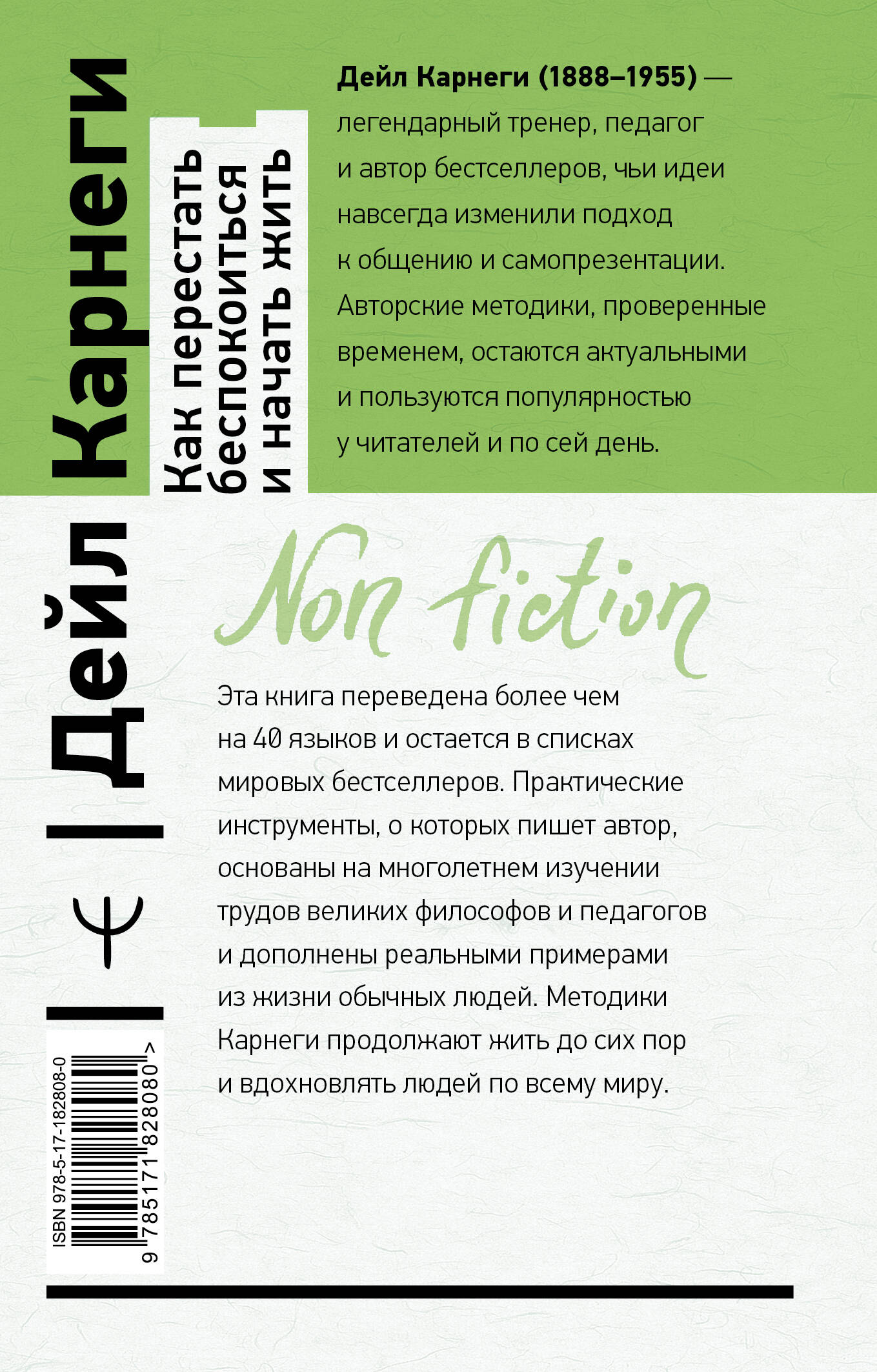 Новое издание вневременного бестселлера Дейла Карнеги в удобном формате и мягком переплете, которое легко носить с собой! Классика, которая улучшила и изменила личную и профессиональную жизнь миллионов людей. Это одна из самых влиятельных книг в мире, она входит во все списки бестселлеров и переведена почти на все языки. Как, почему и зачем нужно научиться любить свою жизнь и получать от нее максимум удовольствия, не жертвуя при этом своими амбициями и желаниями? Сегодня ответ Карнеги как никогда актуален и помогает избавиться от всего, что мешает жить счастливо, принять то, что делает вас сильнее, и отличить первое от второго. Книга "Как перестать беспокоиться и начать жить" научит вас, как: • вытеснить беспокойство из души и жизни; • легко решать проблемы; • находить выход из любой ситуации; • создавать нужное умонастроение; • спокойно реагировать на критику; • избавиться от меланхолии; • преодолеть усталость и быть в тонусе; • перестать переживать и наслаждаться жизнью. Этот бестселлер в новом, современном, полном переводе передает бесценные советы Карнеги без искажения - так, как их сформулировал сам автор.| Издательство | Издательство "АСТ" |
