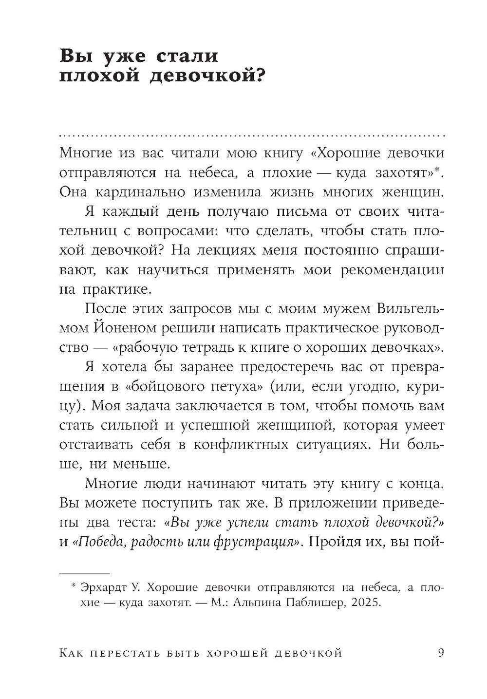 Супербестселлер Уте Эрхардт «Хорошие девочки отправляются на небеса, а плохие - куда захотят» покорил женщин по всему миру и изменил их жизнь к лучшему. Читательницы стали активно обращаться к автору за практической помощью, они просили разъяснить, как последовательно применять идеи ее книги в повседневной жизни. Отсюда и появилось руководство «Как перестать быть хорошей девочкой». Эта рабочая тетрадь - незаменимый инструмент для всех женщин, стремящихся к внутренней свободе и реализации своих желаний. Автор предлагает практические задания, упражнения и конкретные стратегии, чтобы шаг за шагом перенести теоретические идеи в повседневную жизнь: научиться говорить «нет», отстаивать свои границы, слышать собственные желания и признавать ошибки не как поражение, а как опыт. Практикум охватывает ключевые сферы - отношения, работу, семью, дружбу, помогая распознать распространенные ловушки мышления и избавиться от «комплекса хорошей девочки».| Издательство | Альпина Паблишер |
