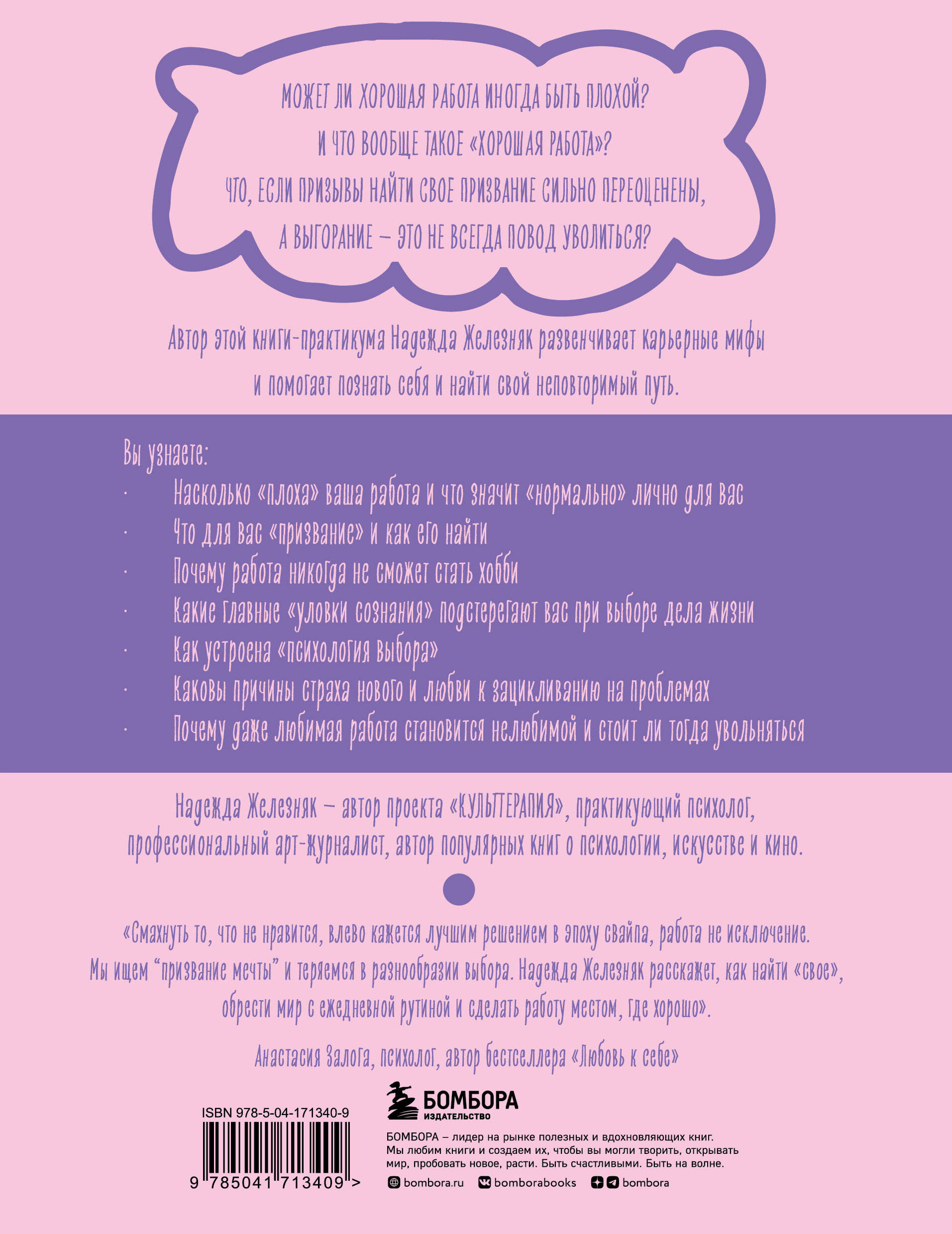 Можно ли найти «идеальную работу» и что делать, если вы до сих пор не знаете, «кем станете, когда вырастете»? Выбор призвания похож на выбор спутника жизни. Да, бывают истории про любовь с первого класса или про то, как девочка начала писать стихи в 2 года, а к 30-ти годам публикует уже 20-й том сочинений. Только это скорее исключения. Автор этой книги-практикума Надежда Железняк развенчивает карьерные мифы и помогает познать себя и найти свой, неповторимый путь. Вы узнаете: • Насколько «плоха» ваша работа и что значит «нормально» лично для вас? • Что для вас «призвание» и как его найти? • Почему работа никогда не сможет стать хобби? • Какие главные «уловки сознания» подстерегают вас при выборе дела жизни? • Как устроена «психология выбора», как найти причины страха нового и любовь к зацикливанию на проблемах? • Почему даже любимая работа становится нелюбимой и стоит ли тогда увольняться? Каждая глава книги посвящена разбору одной из оставляющих дела жизни. Вы будете разбираться с бессознательными убеждениями, страхами, «синдромом самозванца», определите свои истинные потребности и сформируете их карту. Также вам помогут психологические упражнения и особые кинематографические и литературные рекомендации для большего погружения в тему. Проделав предложенные техники, вы поможете своему бессознательному вдоволь разгуляться и найти самые неочевидные ответы! Помните, эта книга - не мотивационная сказка про волшебный успех. Скорее, история с открытым финалом, где вывод каждый сделает сам. Ваша личность и ваш карьерный путь уникальны, позвольте себе разглядеть это. Надежда Железняк - автор проекта «КУЛЬТТЕРАПИЯ», практикующий психолог, киновед, профессиональный арт-журналист. Автор популярных книг и блогов о психологии, искусстве, кино.| Издательство | ООО "Издательство "Эксмо" |