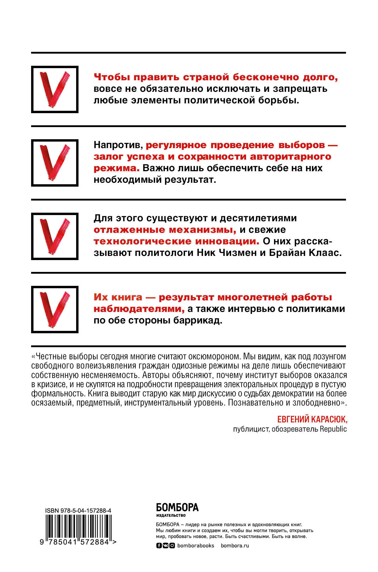 Чтобы править страной бесконечно долго, вовсе необязательно запрещать и исключать любые элементы политической борьбы. Напротив, регулярное проведение выборов - залог устойчивости и стабильности авторитарного режима. Важно лишь обеспечить себе на них необходимый результат. Известные политологи Ник Чизмен и Брайан Клаас собрали «лучшие» мировые практики, позволяющие почти честно побеждать на почти любых выборах. Степень искусности манипуляций разнится от смехотворной до почти незаметной, а их география исключительно широка - от Аргентины и Зимбабве до России и США. Основываясь на личном опыте политической работы и интервью с политиками по обе стороны баррикад, авторы выводят шесть ключевых стратегий, позволяющих править бесконечно долго - и при этом оставаться демократически избранным правителем с массовой народной поддержкой.| Издательство | ООО "Издательство "Эксмо" |