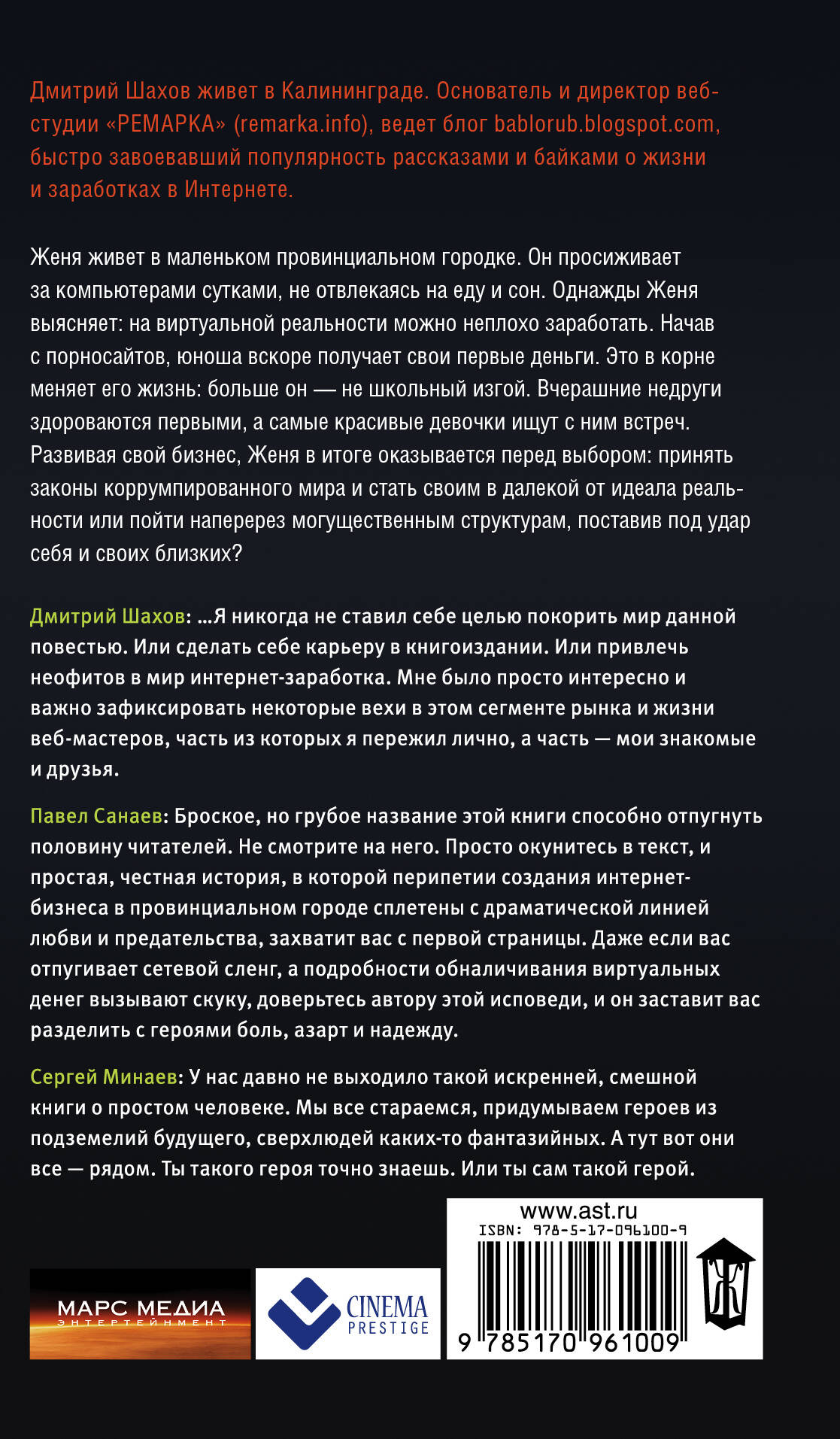 Дмитрий Шахов живет в Калининграде. Основатель и директор вебстудии "РЕМАРКА" (remarka.info), ведет блог bablorub.blogspot.com, быстро завоевавший популярность рассказами и байками о жизни и заработках в Интернете. Эта книга о непростом жизненном пути и взрослении вчерашнего прыщавого подростка, который начал свою многотрудную деятельность с создания порносайтов, и превращении его в человека, исполнившего свою самую главную мечту: он заслужил уважение окружающих.| Издательство | Издательство "АСТ" |