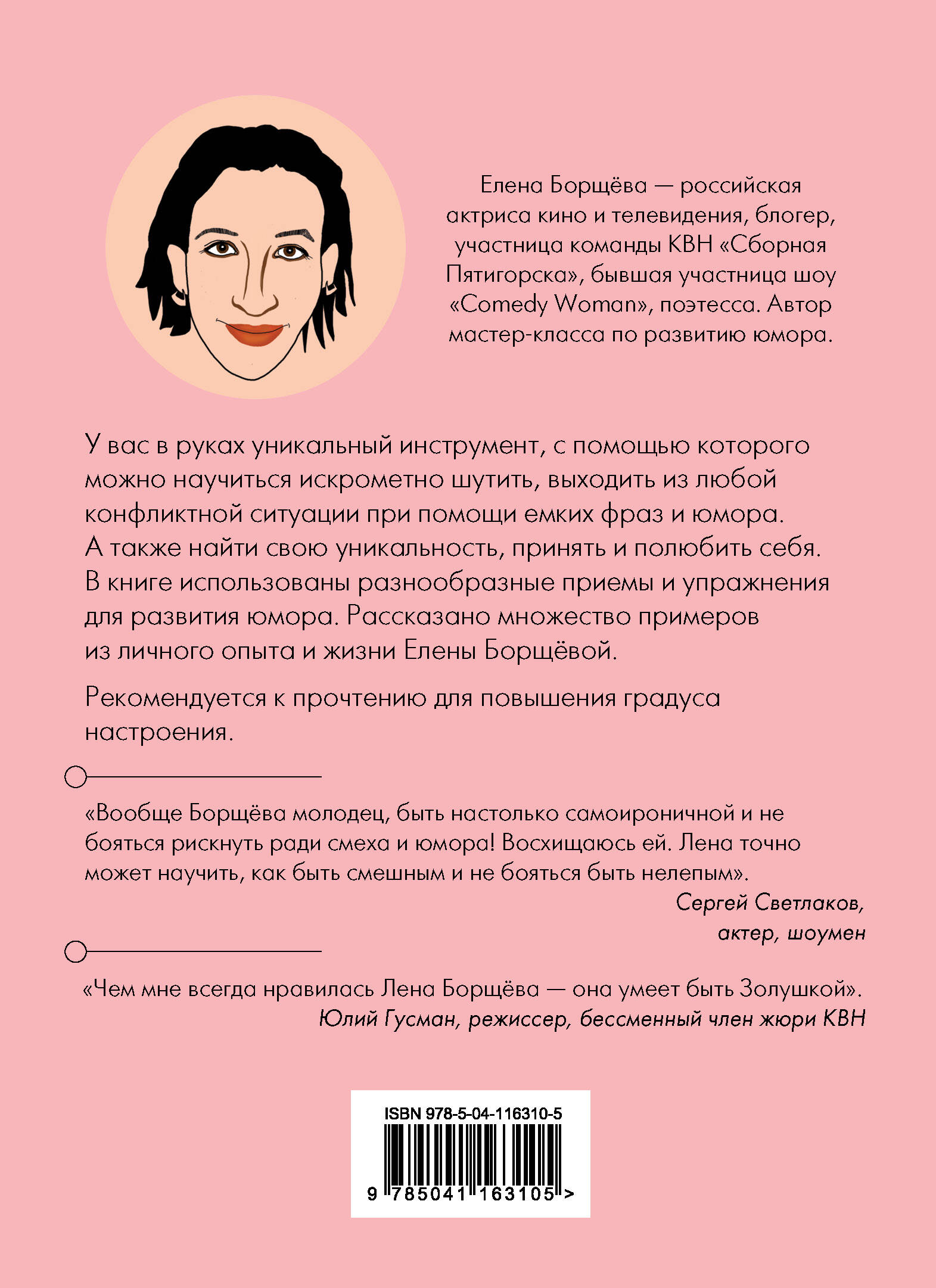 Эта книга о том, как развить чувство юмора и применить его в жизни. Елена Борщёва - участница команды КВН «Сборная Пятигорска» и шоу «Comedy Woman». Елена ведет мастер-классы, помогает развить чувство юмора, повысить уверенность в себе и побороть стресс. В книге - полезные инструменты, с помощью которых можно научиться искрометно шутить, выходить из конфликтной ситуации при помощи емких фраз и юмора. А также найти уникальность, принять и полюбить себя. «Вообще Борщева молодец, быть настолько самоироничной и не бояться рискнуть ради смеха и юмора. Восхищаюсь ей. Лена точно может научить, как быть смешным и не бояться быть нелепым». - Сергей Светлаков, шоумен, юморист, продюсер «Такие мастер-классы, как у Лены, нужны всем! И детям, и взрослым, молодежи и людям 40+. В любой профессии и семейной жизни. Такой своеобразный спасательный круг от серых будней». - Наталья Медведева, актриса, участница шоу «Comedy Woman»| Издательство | ООО "Издательство "Эксмо" |
