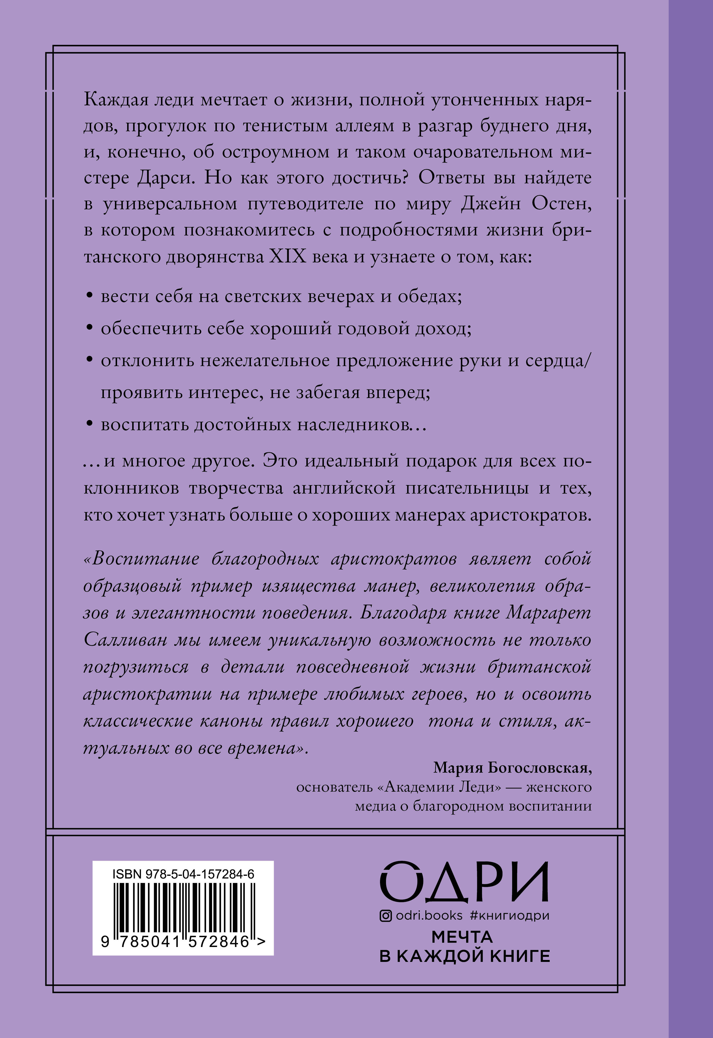 Каждая леди мечтает о жизни, полной утонченных нарядов, прогулок по тенистым аллеям в разгар буднего дня, и, конечно, об остроумном и таком очаровательном мистере Дарси. Но как этого достичь? Ответы вы найдете в универсальном путеводителе по миру Джейн Остен, в котором познакомитесь с подробностями жизни британского дворянства XIX века и узнаете о том, как: - вести себя на светских вечерах и обедах; - обеспечить себе хороший годовой доход; - отклонить нежелательное предложение руки и сердца\ проявить интерес, не забегая вперед; - воспитать достойных наследников… …и многое другое. Это идеальный подарок для всех поклонников творчества английской писательницы и тех, кто хочет узнать больше о хороших манерах аристократов. «Воспитание благородных аристократов являет собой образцовый пример изящества манер, великолепия образов и элегантности поведения. Благодаря книге Маргарет Салливан мы имеем уникальную возможность не только погрузиться в детали повседневной жизни британской аристократии на примере любимых героев, но и освоить классические каноны правил хорошего тона и стиля, актуальных во все времена».
