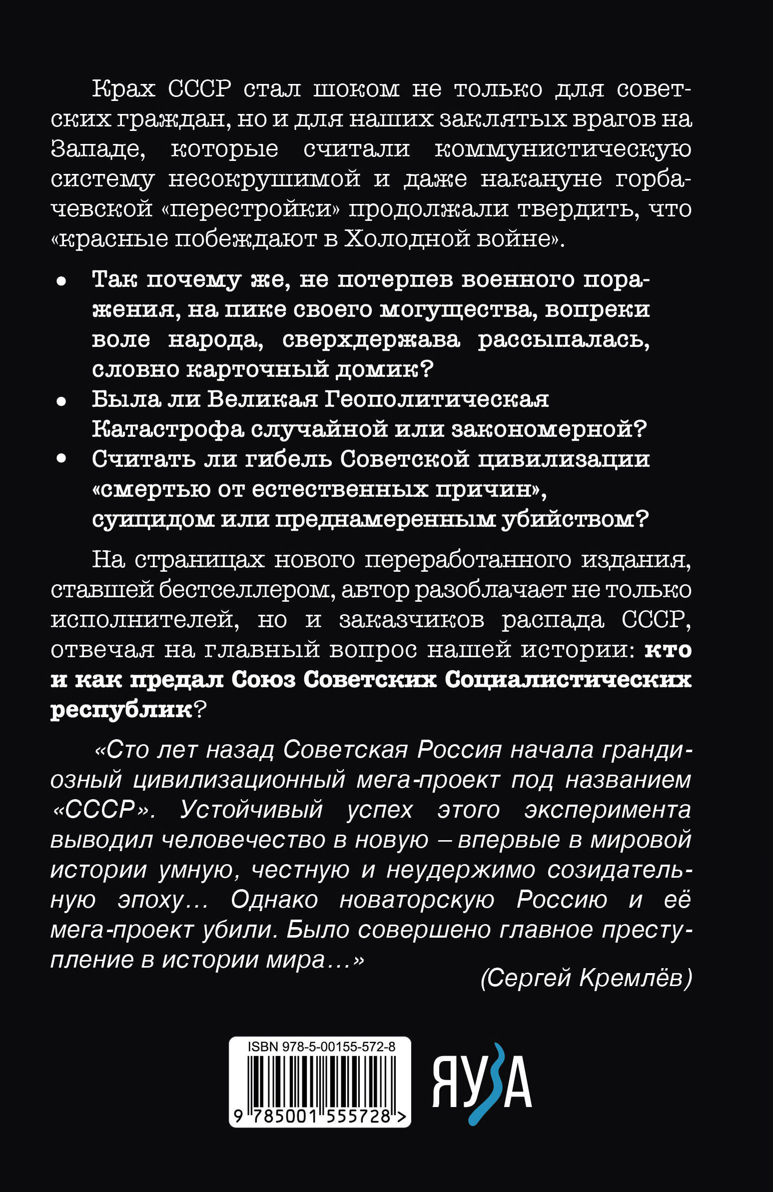 Крах СССР стал шоком не только для советских граждан, но и для наших заклятых врагов на Западе, которые считали коммунистическую систему несокрушимой и даже накануне горбачевской "перестройки" продолжали твердить, что "красные побеждают в Холодной войне". Так почему же, не потерпев военного поражения, на пике своего могущества, вопреки воле народа, сверхдержава рассыпалась, словно карточный домик? Была ли Великая Геополитическая Катастрофа случайной или закономерной? Считать ли гибель Советской цивилизации "смертью от естественных причин", суицидом или преднамеренным убийством? На страницах нового, переработанного издания, книги ставшей бестселлером, автор разоблачает не только исполнителей, но и заказчиков распада СССР, отвечая на главный вопрос нашей истории: кто и как предал Союз Советских Социалистических республик? "Сто лет назад Советская Россия начала грандиозный цивилизационный мега-проект под названием "СССР". Устойчивый успех этого эксперимента выводил человечество в новую - впервые в мировой истории умную, честную и неудержимо созидательную эпоху… Однако новаторскую Россию и ее мега-проект убили. Было совершено главное преступление в истории мира…" (Сергей Кремлёв)| Издательство | Яуза-каталог ООО |