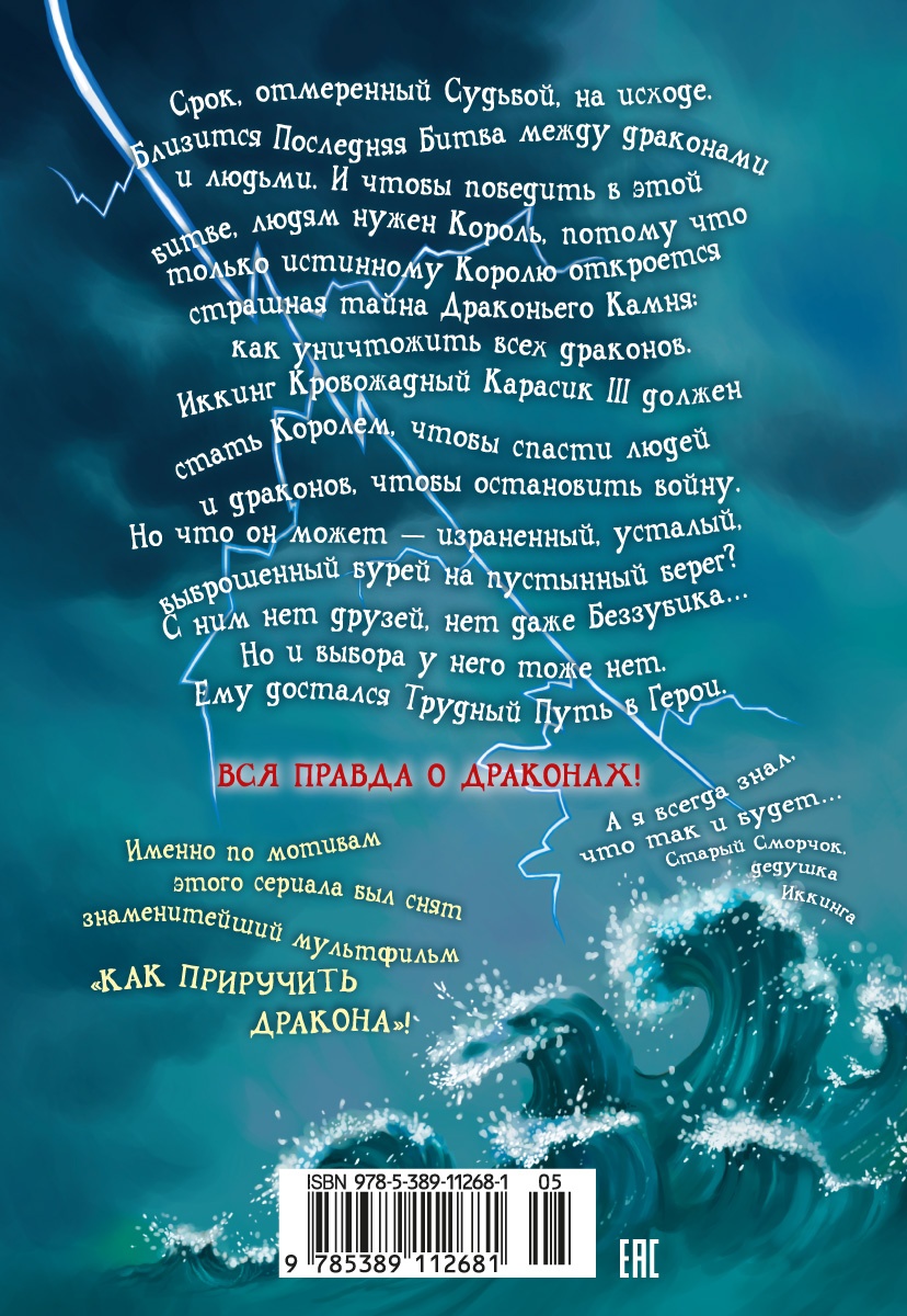 Срок, отмеренный Судьбой, на исходе. Близится Последняя Битва между драконами и людьми. И чтобы победить в этой битве, людям нужен Король, потому что только истинному Королю откроется страшная тайна Драконьего Камня: как уничтожить всех драконов. Иккинг Кровожадный Карасик III должен стать Королем, чтобы спасти людей и драконов, чтобы остановить войну. Но что он может - израненный, усталый, выброшенный бурей на пустынный берег? С ним нет друзей, нет даже Беззубика… Но и выбора у него тоже нет. Ему достался Трудный Путь в Герои. Впервые на русском языке!| Издательство | Азбука |