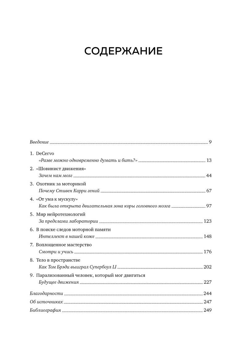 Движение - отбиваете ли вы бейсбольный мяч, летящий со скоростью 150 км/ч, или просто протягиваете руку за чашкой кофе - вовсе не представляет собой нечто само собой разумеющееся, а является результатом многоступенчатых расчетов в мозге. Стремясь найти ответ на вопрос, что на самом деле определяет эффективность двигательной системы человека и наши удивительные физические возможности, журналист и спортивный обозреватель Зак Шонбран взял интервью у специалистов из разных стран, которые изучают связь между моторикой и процессами, происходящими в мозге, и обобщил результаты современных исследований. Итогом его кропотливой работы стала эта книга - исследование нейробиологии движения (того, как мозг влияет на нашу двигательную активность и позволяет избранным людям добиться удивительных результатов в спорте), включая историю изучения вопроса великими умами прошлого (Платон, Аристотель, Шекспир, Декарт). Много внимания уделено зарождению мира новейших нейротехнологий, ярко представленных компанией deCervo, которая использовала методы нейровизуализации для оценки бейсболистов, чтобы повысить их результативность и шансы на победу в матчах. Новые теории и технологии в применении к самым разным видам спорта открывают нам, как функционирует система управления движениями в мозге талантливых бейсболистов и других спортсменов, таких как баскетболист Стивен Карри, футболист Том Брэди и теннисистка Серена Уильямс, а также музыкантов-виртуозов, танцоров, скалолазов, автогонщиков и представителей многих других профессий.| Издательство | Издательство АЗБУКА ООО |