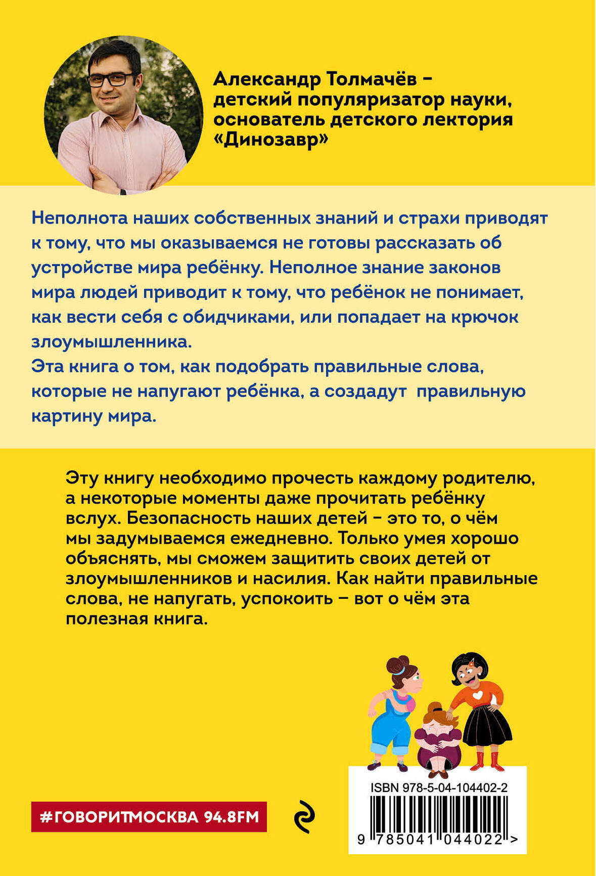 Александр Толмачёв - детский популяризатор науки, основатель детского лектория "Динозавр". Неполнота наших собственных знаний и страхи приводят к тому, что мы оказываемся не готовы рассказать об устройстве мира ребёнку. Неполное знание законов мира людей приводит к тому, что ребёнок не понимает, как вести себя с обидчиками, или попадает на крючок злоумышленника. Эта книга о том, как подобрать правильные слова, которые не напугают ребёнка, а создадут правильную картину мира.| Издательство | ООО "Издательство "Эксмо" |
