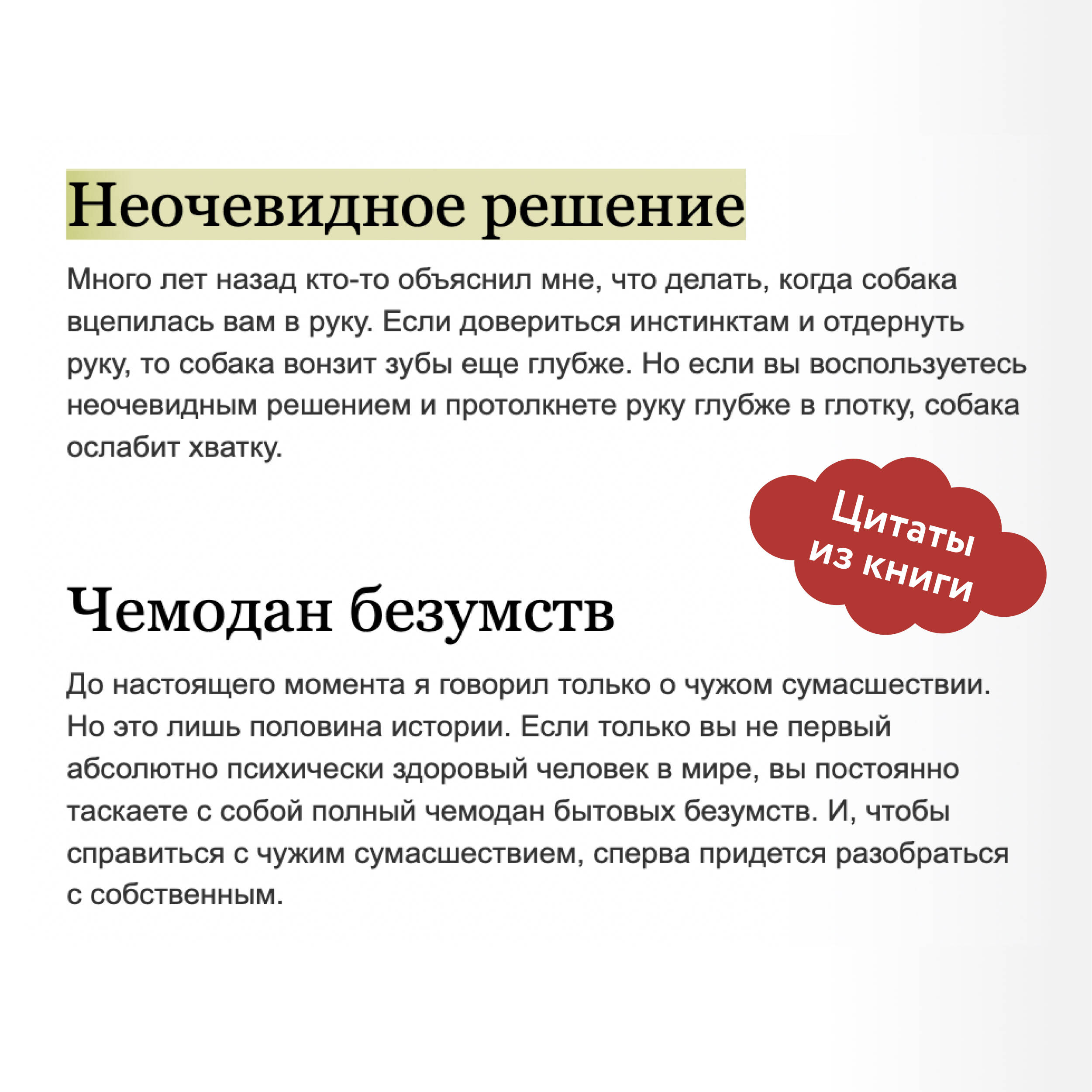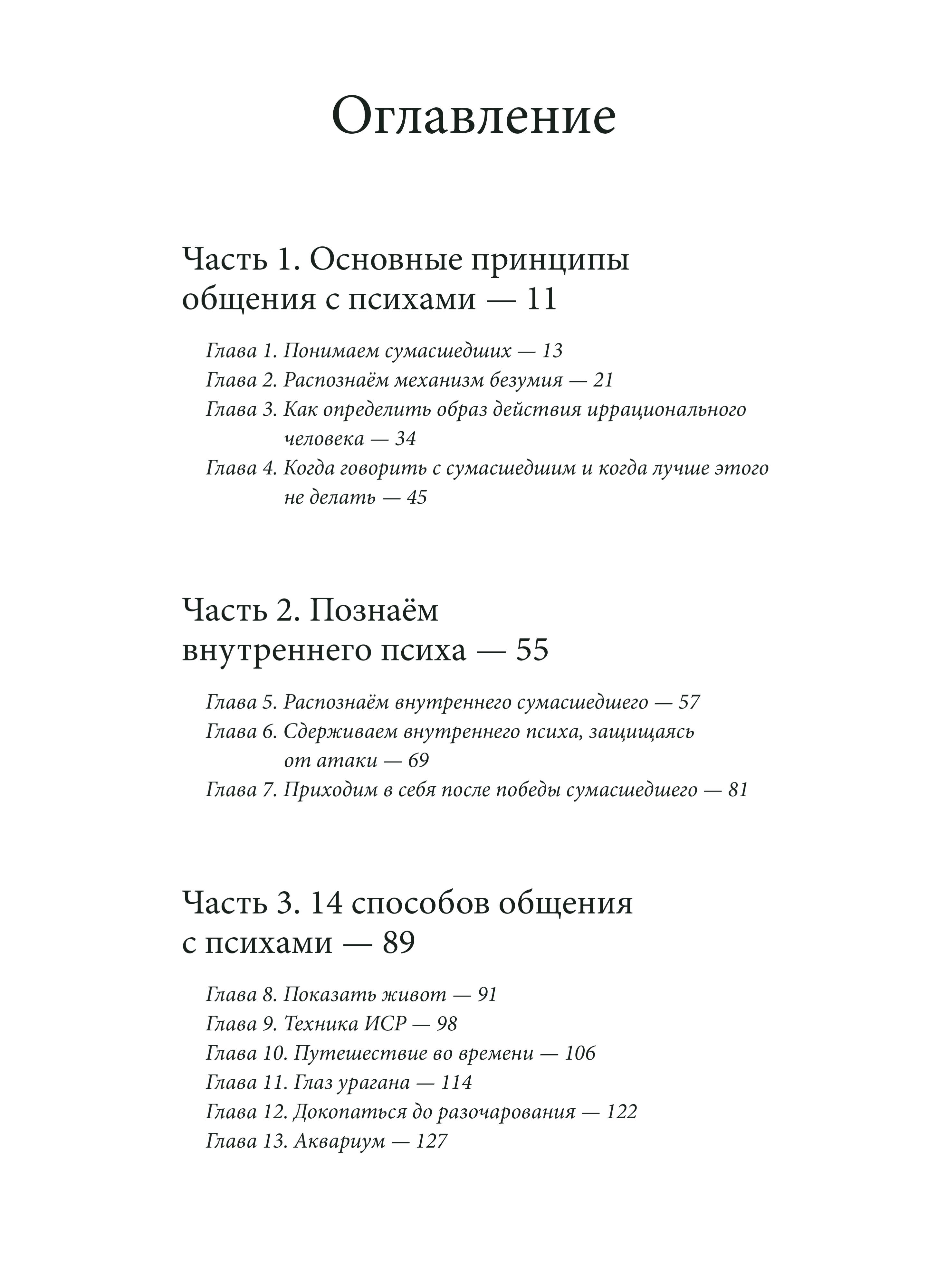 Это книга о том, как общаться с невыносимыми людьми и сохранять при этом здравый рассудок. В ней вы найдете конкретные техники психологической защиты от "бытовых сумасшедших", заражающих своей иррациональностью и не способных конструктивно и здраво решить ни один вопрос.| Издательство | Манн, Иванов и Фербер |