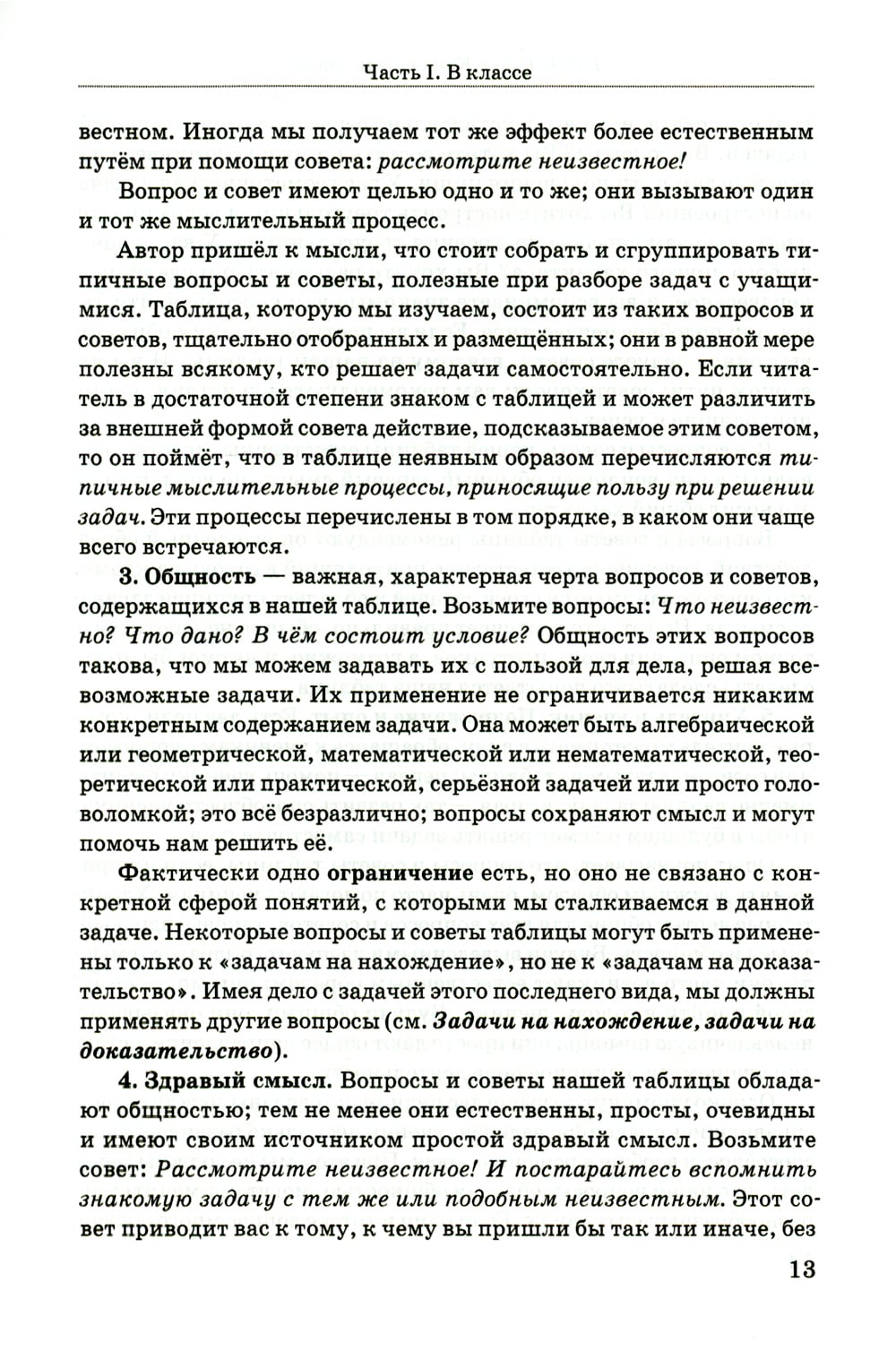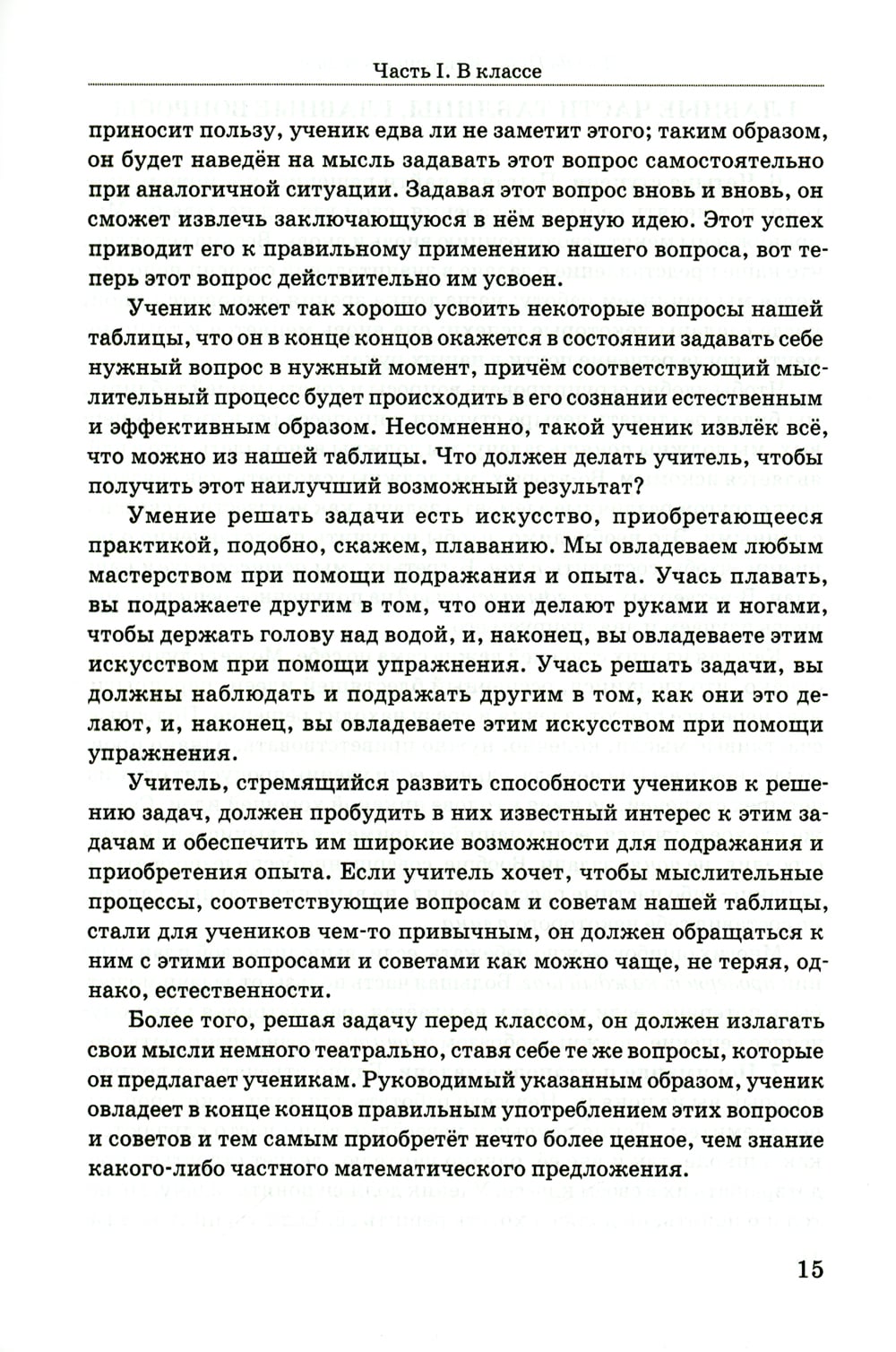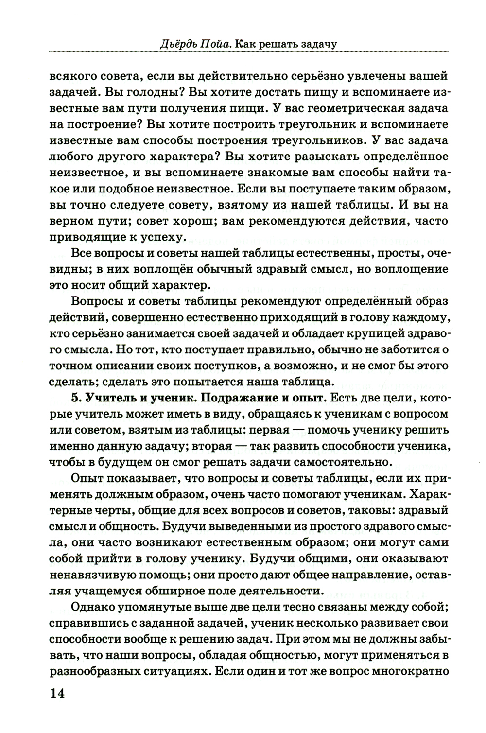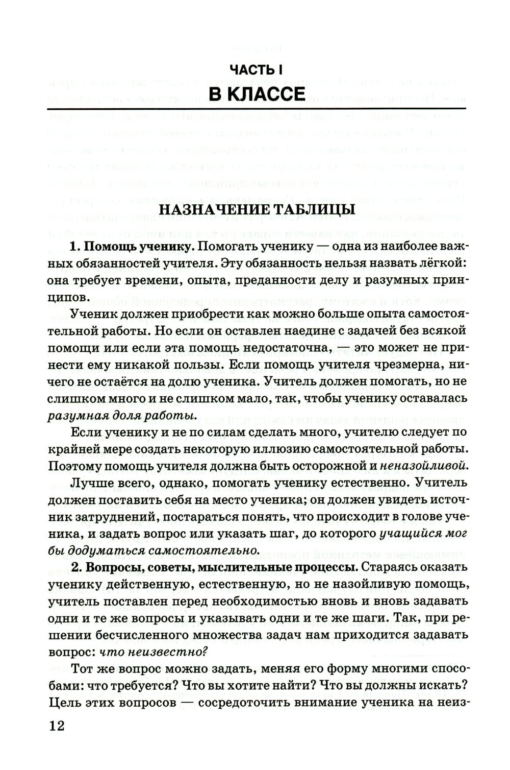 Как решить математическую задачу? Выучить формулы? Выстроить последовательность вычислений? Найти похожий пример? А может быть, решение уже есть - осталось лишь его найти? Пособие для учителей «Как решить задачу» известного американского математика Д. Пойа предлагает универсальную методику обучения решению задач. Она основана на развитии навыков эвристического мышления у учащихся. Именно творческая активность формирует математическую самостоятельность при работе с любыми задачами. Теоретический материал состоит из трёх частей: работы над задачей в классе, построения и реализации плана её решения и краткого эвристического словаря. В качестве инструмента автор предлагает поэтапную схему ответов ученика на наводящие вопросы учителя. Пособие будет полезно как учителям и репетиторам, так и родителям, занимающимся с детьми самостоятельно.| Издательство | Советские учебники |