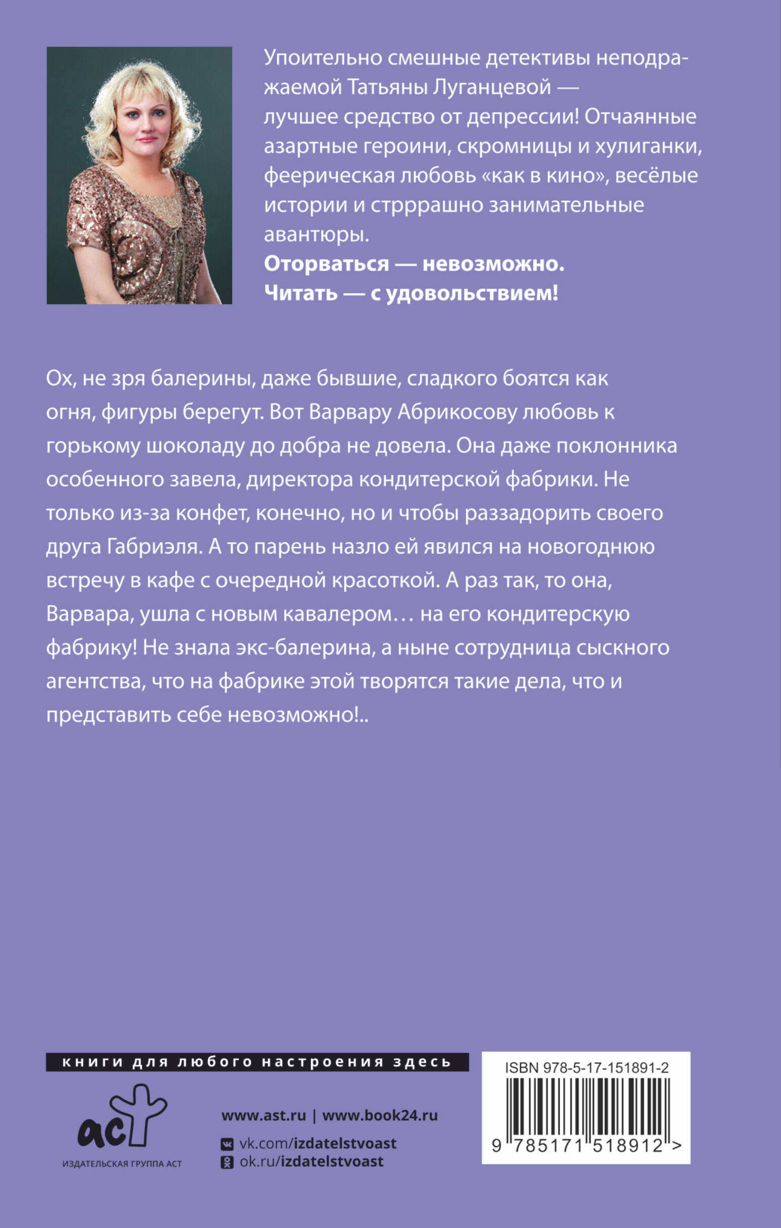 Ох, не зря балерины, даже бывшие, сладкого боятся как огня, фигуры берегут. Вот Варвару Абрикосову любовь к горькому шоколаду до добра не довела. Она даже поклонника особенного завела, директора кондитерской фабрики. Не только из-за конфет, конечно, но и чтобы раззадорить своего друга Габриэля. А то парень назло ей явился на новогоднюю встречу в кафе с очередной красоткой. А раз так, то она, Варвара, ушла с новым кавалером… на его кондитерскую фабрику! Не знала экс-балерина, а ныне сотрудница сыскного агентства, что на фабрике этой творятся такие дела, что и представить себе невозможно!..| Издательство | ИЗДАТЕЛЬСТВО "АСТ" |