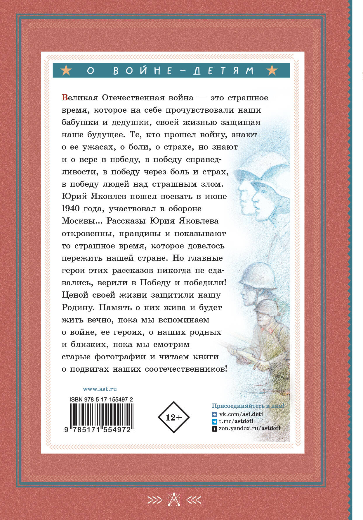 Война - это страшное слово, которое на себе прочувствовали наши бабушки и дедушки во время Великой Отечественной войны, своей жизнью защищая наше будущее. Те, кто прошел войну, знают о ее ужасах, о боли, о страхе, но знают и о вере в победу, в победу справедливости, в победу через боль и страх, в победу людей над страшных злом. Юрий Яковлев был призван на военную службу в июне 1940 года, участвовал в обороне Москвы… Рассказы Юрия Яковлева откровенны, правдивы и показывают то страшное время, которое довелось пережить нашей стране. Но главные герои этих рассказов никогда не сдавались, верили в Победу и победили! Ценой своей жизни защитили нашу Родину. Память о них жива и будет жить вечно, пока мы вспоминаем о войне, ее героях, о наших родных и близких, пока мы смотрим старые фотографии и читаем книги о подвигах наших соотечественников!| Издательство | ИЗДАТЕЛЬСТВО "АСТ" |