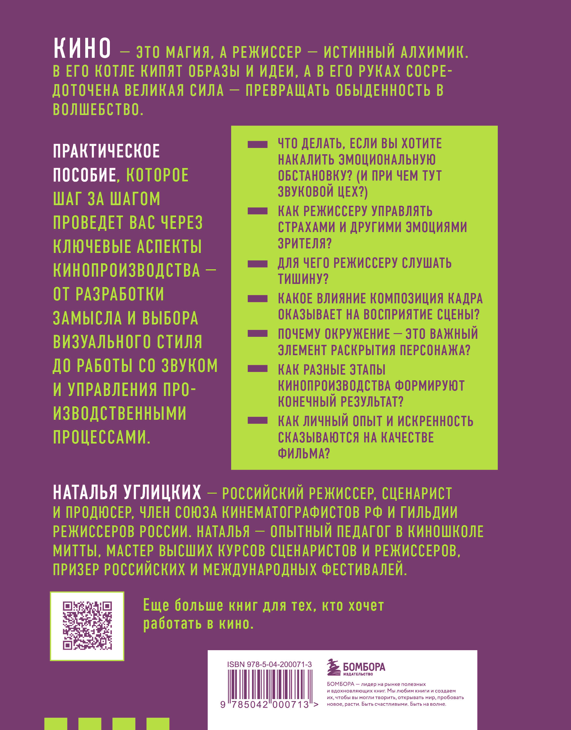 «Это и есть главная задача фильма: вызвать настоящие эмоции». - Наталья Углицких «Как снять свой первый фильм. От идеи до премьеры» - это практическое пособие, которое проведет вас через все этапы кинопроизводства, от замысла до его реализации на экране. Выбор жанра, разработка сценария, организация производственного процесса… Все эти действия часто ставят в тупик молодого режиссера. Опираясь на богатый опыт работы в киноиндустрии, Наталья Углицких, российский режиссер, продюсер и преподаватель режиссуры, делится секретами создания первого фильма и вдохновляет начинающих кинематографистов на путь к успеху. - В чем кроется разница между подходами сценариста, режиссера и продюсера? - Какое влияние звук оказывает на эмоциональное восприятие фильма? - Почему некоторые сцены выглядят напряженными, а некоторые - не цепляют вовсе? - Как грамотно распланировать весь съемочный процесс? - Зачем режиссеру разбираться в работе гримерного цеха? Режиссер - это главный человек на съемочной площадке, первое имя в титрах и большая ответственность. Не бойтесь экспериментировать, ошибаться, искать новые подходы и творить - и пусть эта книга поможет в становлении великого режиссера! Наталья Углицких - российский режиссер, сценарист и продюсер, член Союза кинематографистов РФ и Гильдии режиссеров России. Наталья - опытный педагог в Киношколе Александра Митты, мастер Высших курсов сценаристов и режиссеров.| Издательство | ООО "Издательство "Эксмо" |