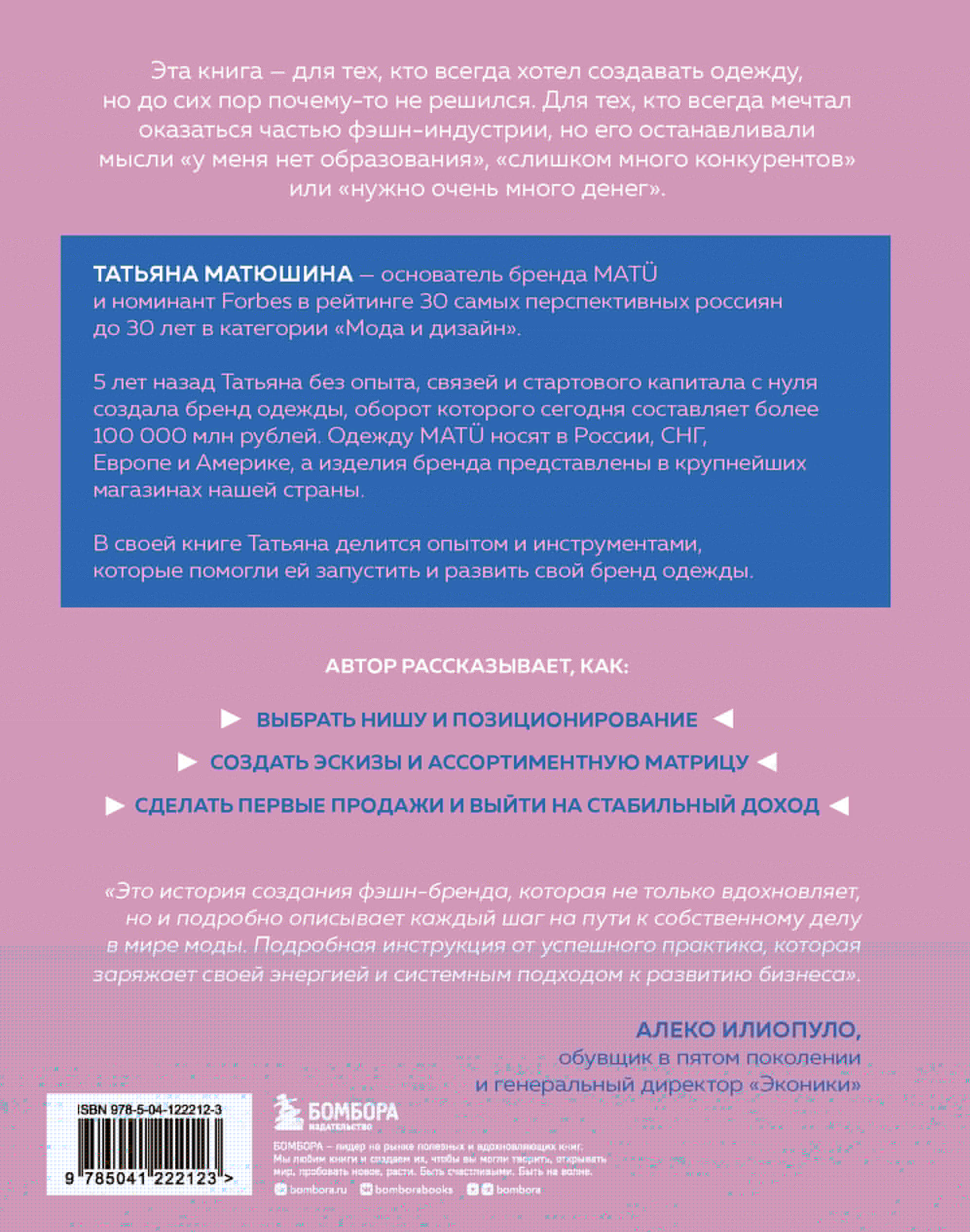Эта книга - для тех, кто всегда хотел создавать одежду, но до сих пор почему-то не решился. Для тех, кто всегда мечтал оказаться частью фэшн-индустрии, но его останавливали мысли «у меня нет образования», «слишком много конкурентов» или «нужно очень много денег». Татьяна Матюшина - основатель бренда MATÜ и номинант Forbes в рейтинге 30 самых перспективных россиян до 30 лет в категории «Мода и дизайн». 5 лет назад Татьяна без опыта, связей и стартового капитала с нуля создала бренд одежды, оборот которого сегодня составляет более 200 000 млн рублей. Одежду MATU сегодня носят в России, СНГ, Европе и Америке, а изделия бренда представлены в крупнейших магазинах нашей страны. В своей книге Татьяна делится опытом и инструментами, которые помогли ей запустить и развить свой бренд одежды. В своей книге она рассказывает, как - выбрать нишу и позиционирование; - создать эскизы и ассортиментную матрицу; - сделать первые продажи и выйти на стабильный доход. «Это история создания фэшн-бренда, которая не только вдохновляет, но и подробно описывает каждый шаг на пути к собственному делу в мире моды. Эта книга - подробная инструкция от успешного практика, которая заряжает своей энергией и системным подходом к развитию бизнеса». АЛЕКО ИЛИОПУЛО, обувщик в пятом поколении и генеральный директор компании «Эконика»| Издательство | ООО "Издательство "Эксмо" |